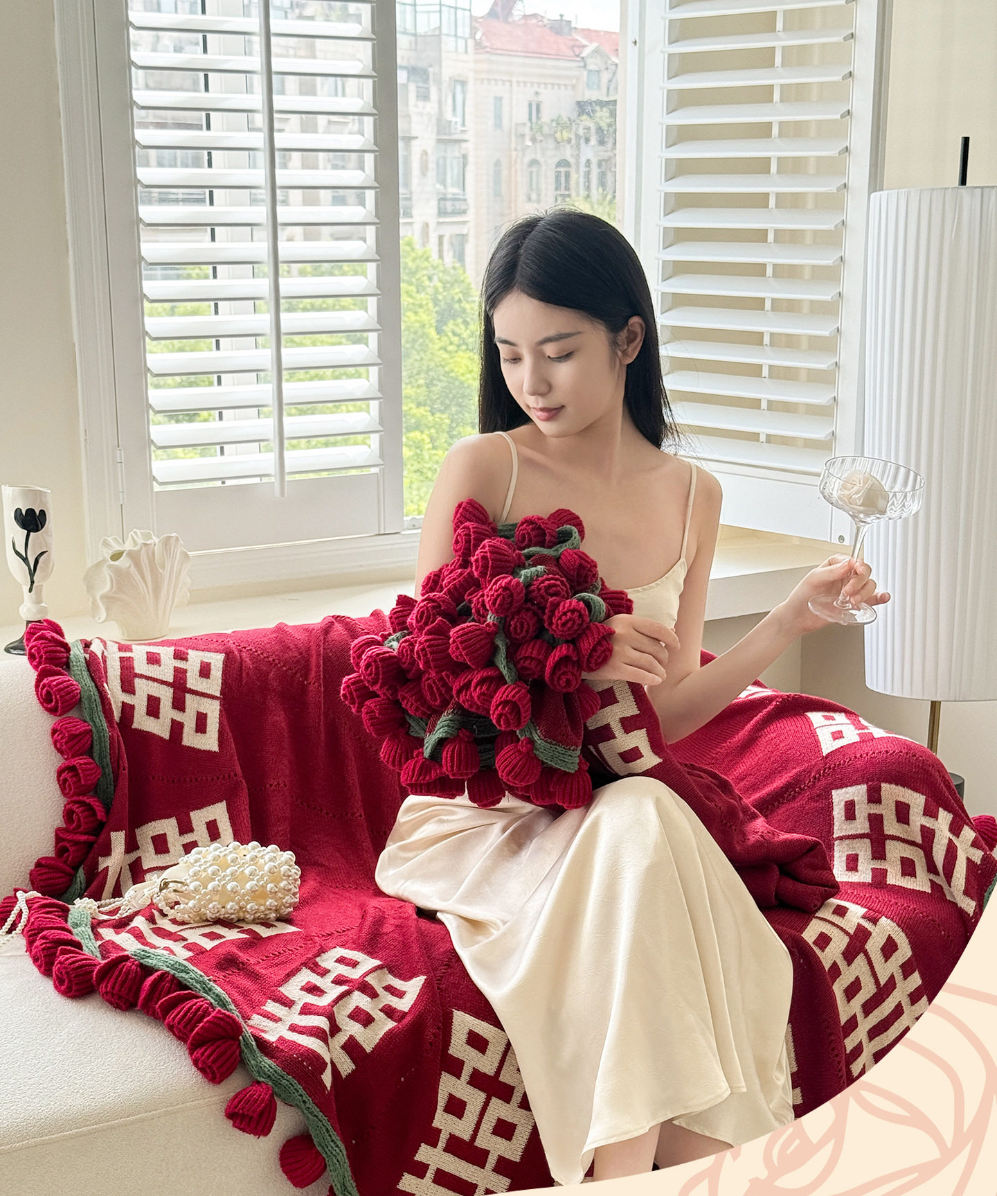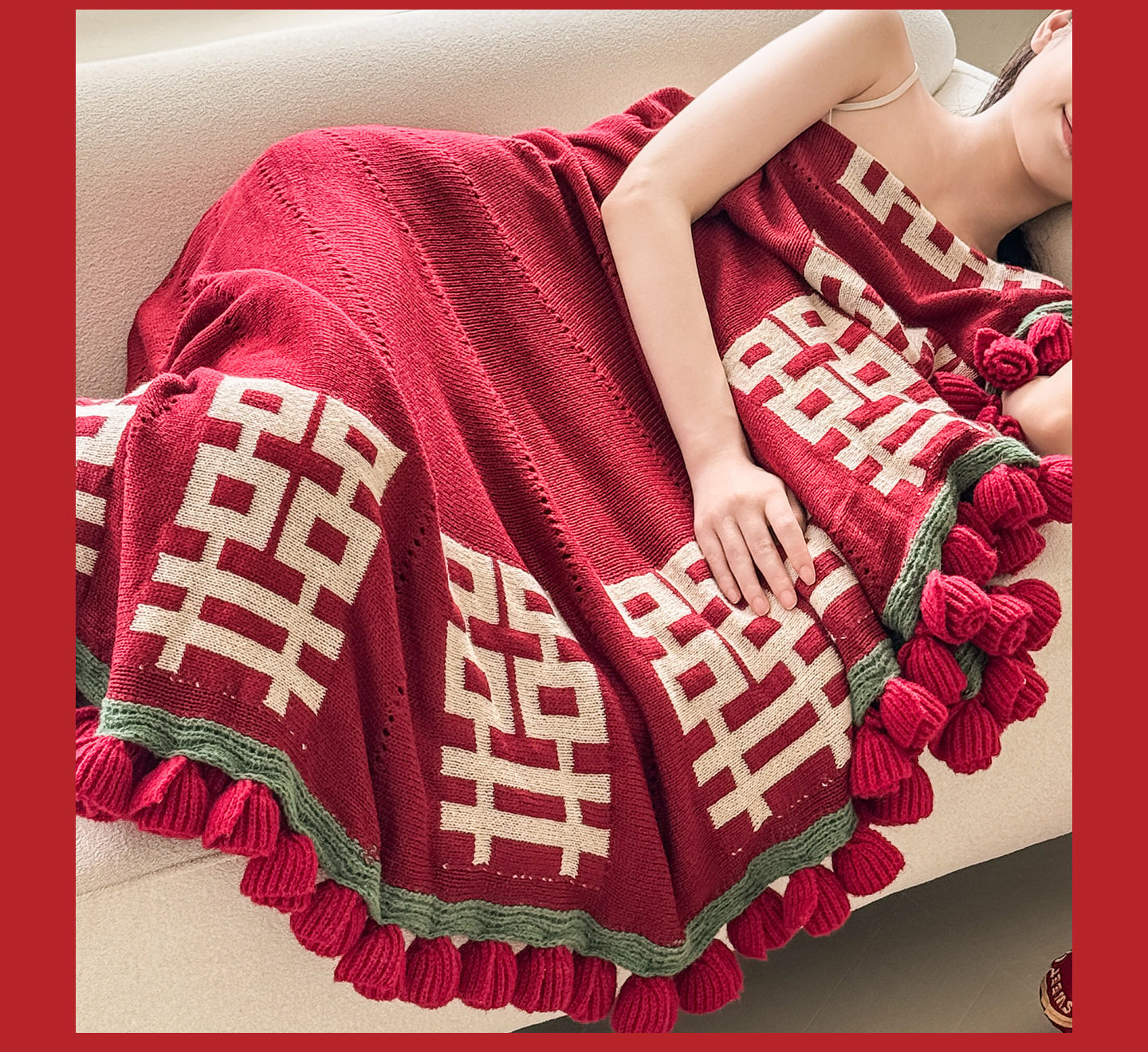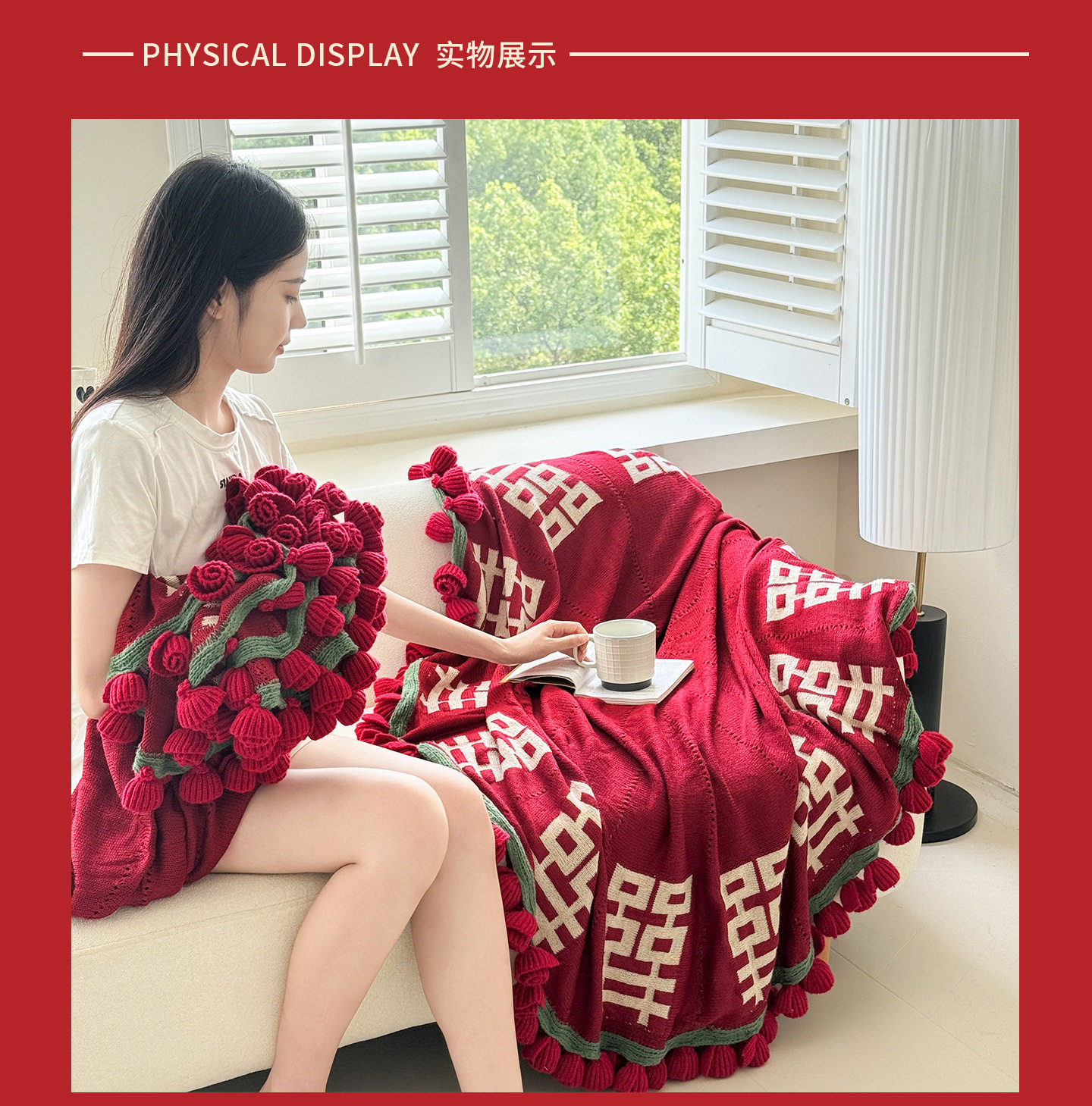 | Color | Flower blanket with red double happiness characters |
