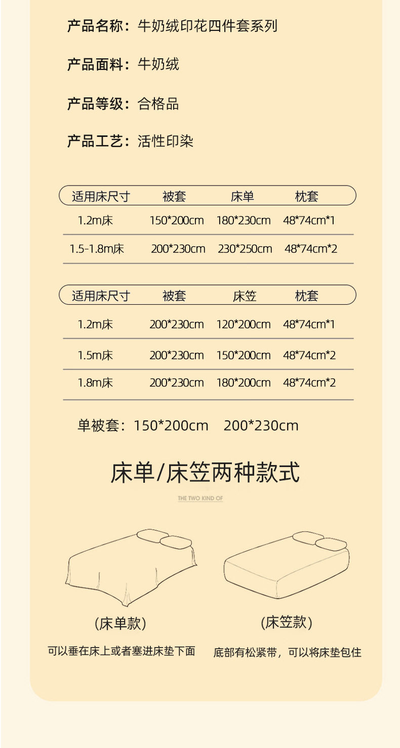 | Dimensions | 1.2m bed sheet three-piece set,1.5m bed sheet four-piece set,1.8m bed sheet four-piece set,1.2m fitted sheet three-piece set,1.5m fitted sheet set of four,1.8m fitted sheet set of four,Single quilt cover 150x200,Single quilt cover 200x230,Pillowcase 48x74/only |
