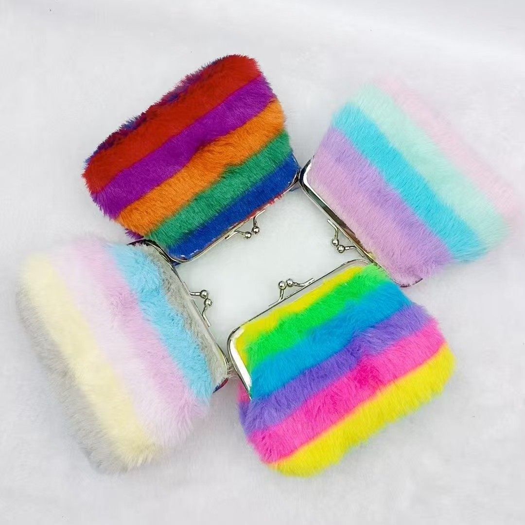 New Stripesd Plush Coin Purse, 4inch Rainbow Bank Card Storage Bag, Small Gift Key Bag