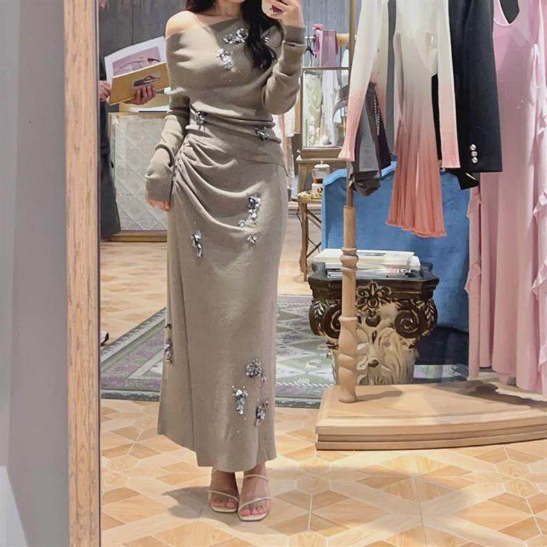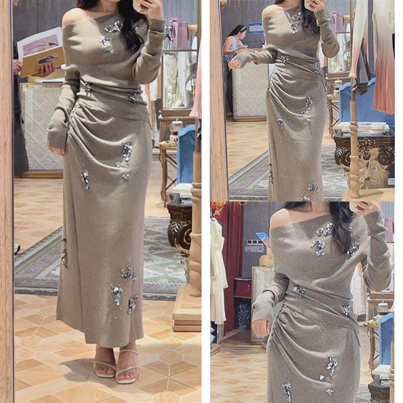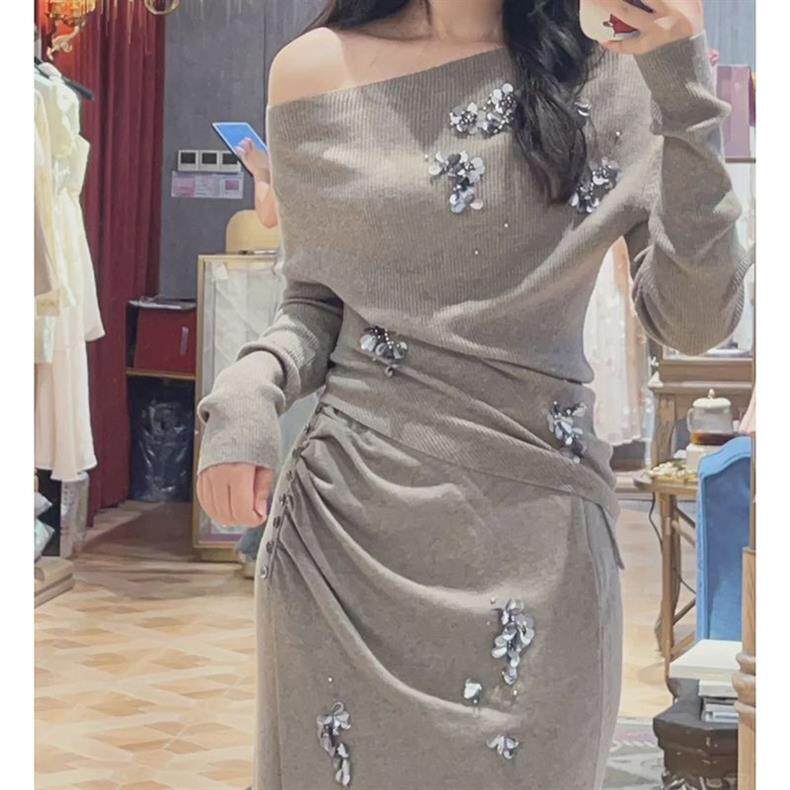 [Two-Piece Set] Slanted Shoulder Slim Casual Fashion Slimming Look Top Pullover Knitwear + Skirt Suit for Women