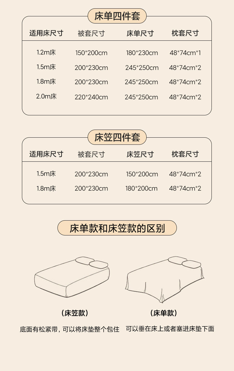 | Size specifications | 1.2m bed sheet three-piece set,1.5m bed sheet four-piece set,1.8m bed sheet four-piece set,2.0m bed sheet four-piece set,1.5m fitted sheet set of four,1.8m fitted sheet set of four |