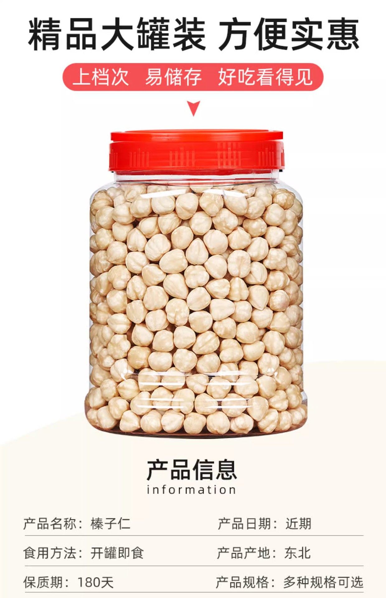 | Packaging specifications | [original flavor·half a pound] hazelnuts (250g in total),【original flavor· 0.5kg 】hazelnuts (500g in total),【original flavor· 1.0kg 】hazelnuts (1000g in total),(selected large) hazelnut kernels (250g in total),(selected large) hazelnut kernels total 500g,"(selected large) hazelnut kernels (750g in total)",(selected large) hazelnut kernels (1000g in total) |