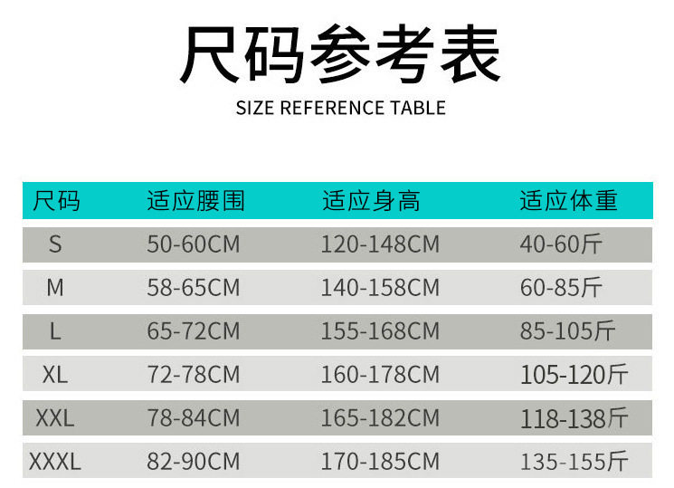 | Specifications | S code ( 20-30kg ),M code ( 30-42.5kg ),L size ( 42.5-52.5kg ),Xl code ( 52.5-60kg ),2xl code ( 60-69kg ),3xl code ( 69-77.5kg ) |