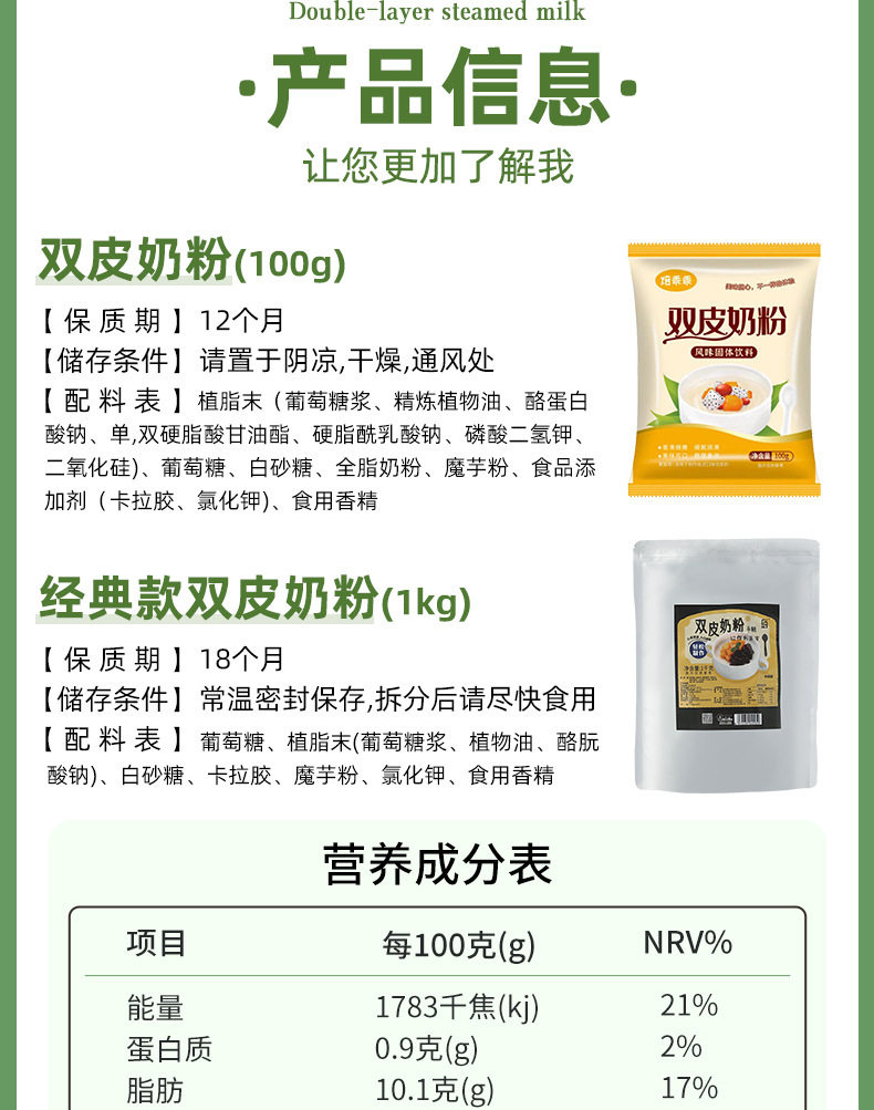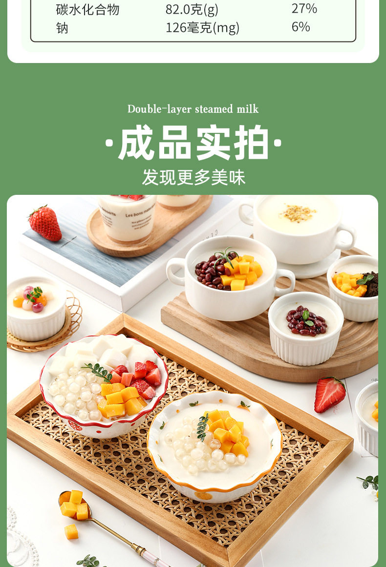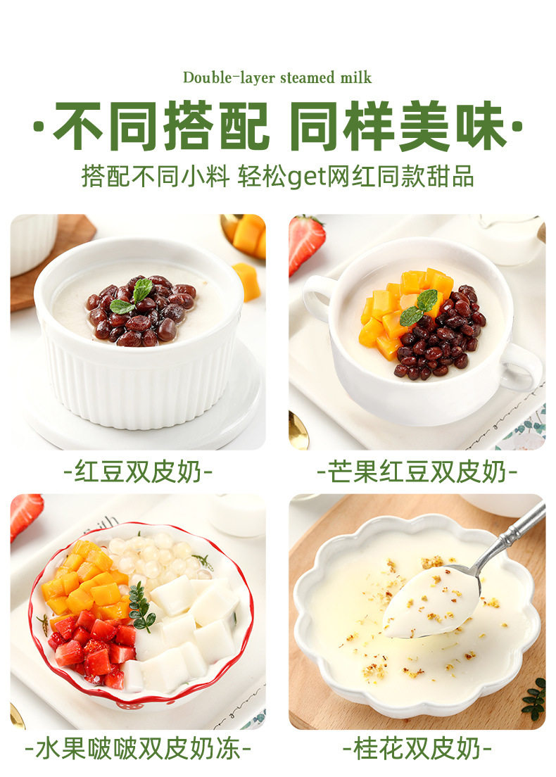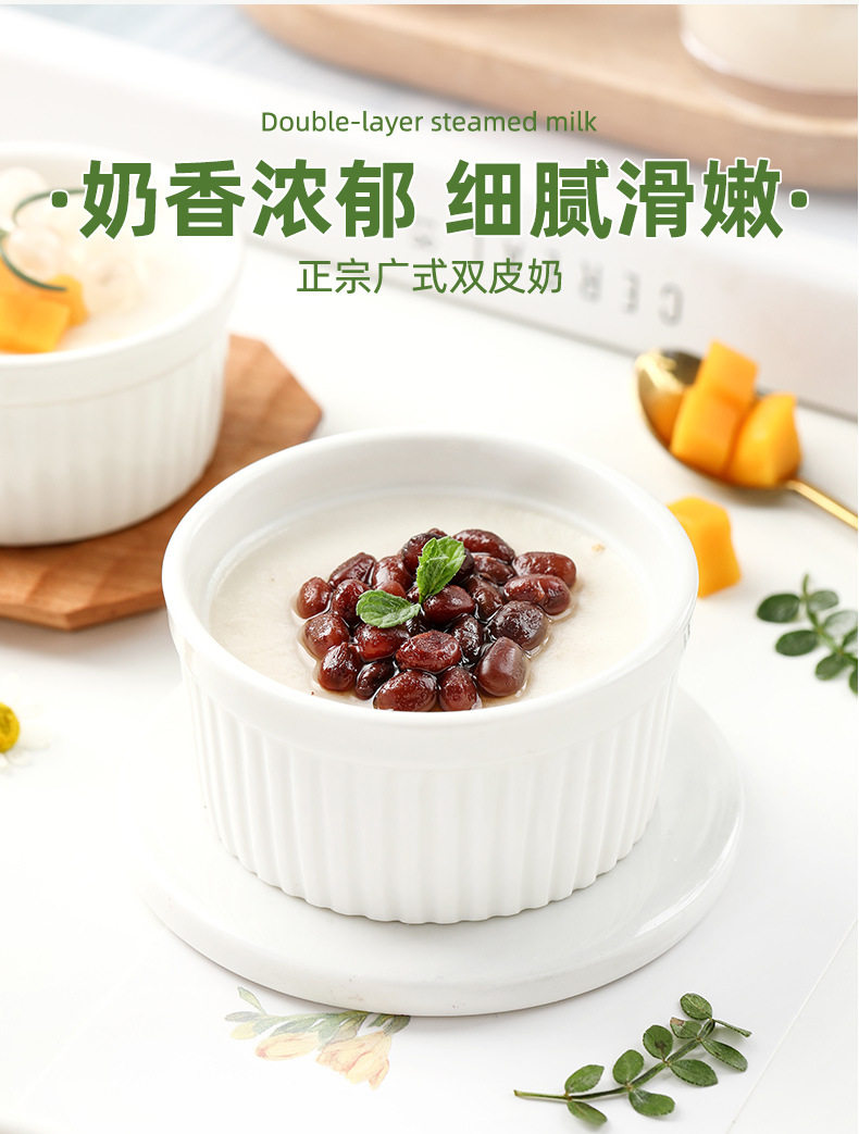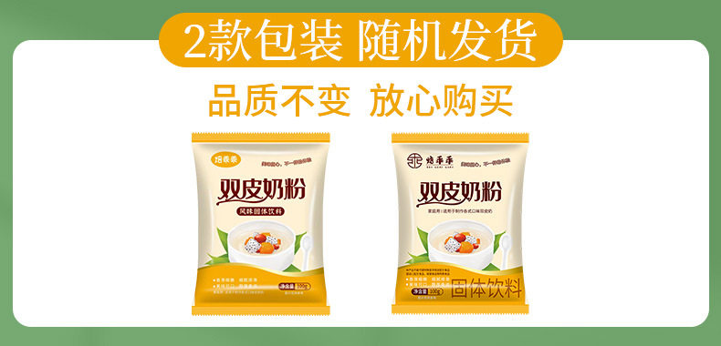 Specifications [loss impulse] double skin milk powder 100g*5 packs (5 packs of honey beans included),[family pack] double skin milk powder 100g*5 packs (comes with measuring cup),[commercial packaging] double skin milk powder 1kg*1 bag (1.0kg),[commercial packaging] double skin milk powder 1kg*2 bags (2kg),[buy 5 get 3 free] double skin milk powder 100g*5 bags (3 bags + measuring cup free),[affordable pack] double skin milk powder 100g*10 packs (comes with measuring cup),[family pack] double skin milk powder 100g*3 packs (comes with measuring cup),[try pack] double skin milk powder 100g*2 packs (comes with measuring cup),[tasting pack] double skin milk powder 100g*1 pack (comes with measuring cup + honey beans),[group purchase pack] double skin milk powder 100g*20 packs,[group purchase pack] double skin milk powder 100g*50 packs,[commercial wholesale packaging] double skin milk powder 1kg*10 bags,[commercial packaging] double skin milk powder 1kg*3 bags,[commercial packaging] double skin milk powder 1kg*5 bags,[coconut honey beans] 5 packs of cantonese-style double-skinned milk + 5 packs of honey beans + 5 cups of coconut fruit,[coconut honey beans] 10 packs of cantonese-style double-skinned milk + 10 packs of honey beans + 10 cups of coconut fruit,Double skin milk powder 1kg + special milk powder 100g,[red bean double skin milk] 3 packs of double skin milk + 10 packs of honey beans*20g,[red bean double skin milk] 10 packs of double skin milk + 10 packs of honey beans*20g,[taro balls and honey beans] 5 packs of double-skinned milk + 5 packs of honey beans + 500g of small taro balls,[osmanthus double skin milk] 3 packs of double skin milk + 250g*1 bottle of sugar osmanthus,[oreo double skin milk] 3 packs of double skin milk + 400g cocoa biscuit crumbs,[exploding pearl double skin milk] 3 packs of double skin milk + 500g of water chestnut popping beads,Ready-to-eat honey beans 500g,Honey beans 20g*5 packs,Honey beans 20g*10 packs,Honey beans 20g*30 packs,Four flavors and four colors of small taro balls 500g (stored at room temperature),Coconut granules 40g*10 cups,【0 fat】horseshoe explosive beads 500g,【0 fat】strawberry flavored crispy bobo 500g,【0 fat】peach flavored crispy bobo 500g,Blueberry jam 400g,Horseshoe popping beads 500g,Rose jam 400g,20 sets of special packaging boxes (with lid + spoon) and 22 stickers included,25 sets of dessert wood bran cups (including round lid + spoon),50 sets of dessert wood bran cups (including round lid + spoon),Set of 20 round pudding cups (including covered spoons) with free stickers,Set of 20 square pudding cups (including covered spoons) with free stickers,[date freshness] authoritative testing, you can eat with confidence,[bobo double skin milk] 3 packs of double skin milk + original crispy bobo 500g,Internet celebrity snacks: 3 pieces of honey beans 500g + mango popping beads 500g + cocoa biscuit crumbs 400g