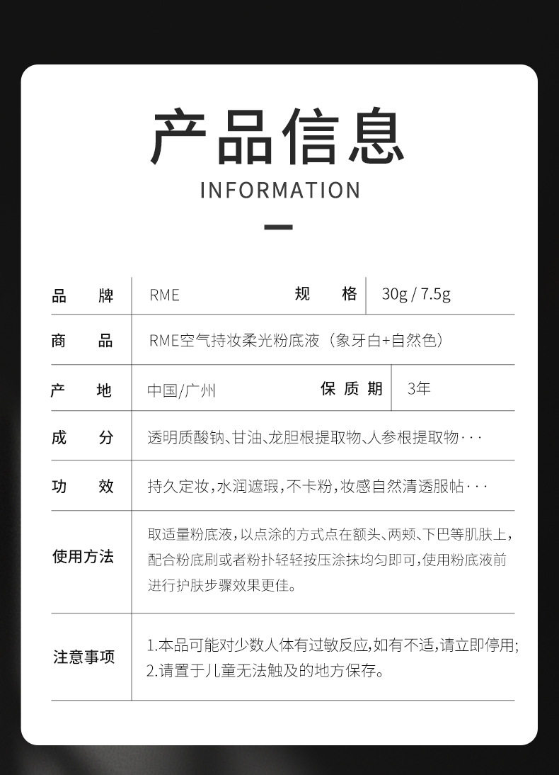 | Color classification | Rme air-lasting soft light liquid foundation 30g (natural color),Rme air-lasting soft light foundation 30g (ivory white),Rme air-lasting soft light liquid foundation 7.5g (natural color) |