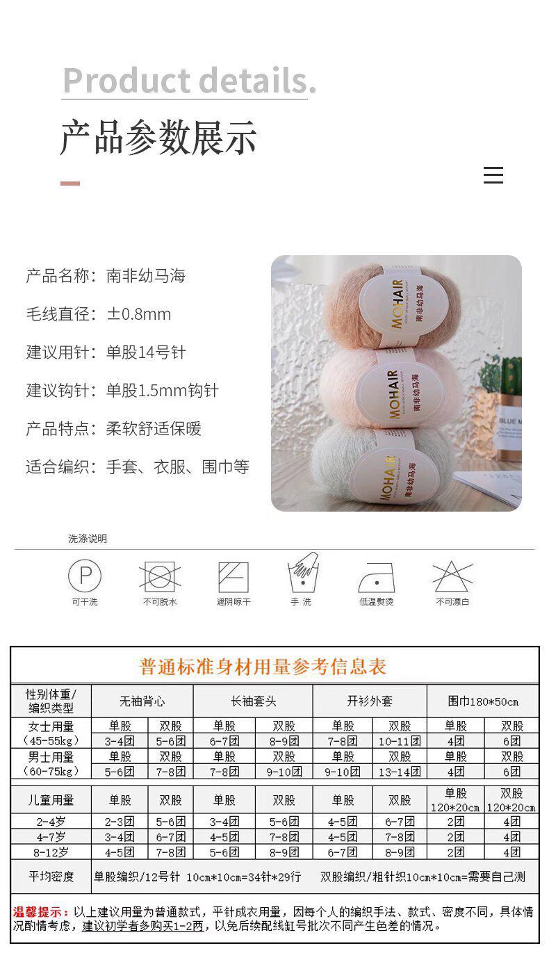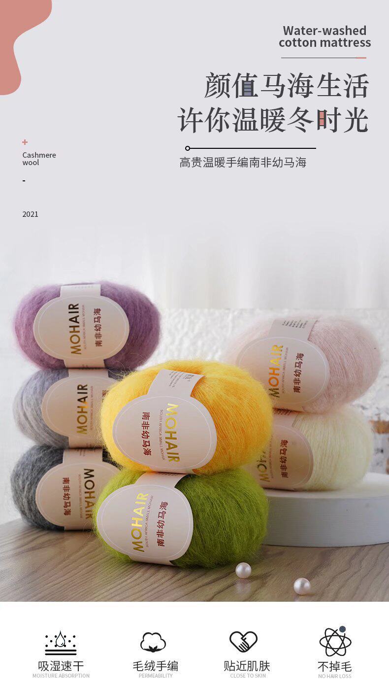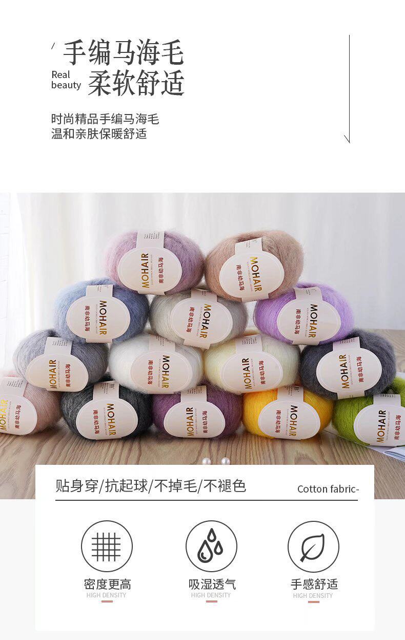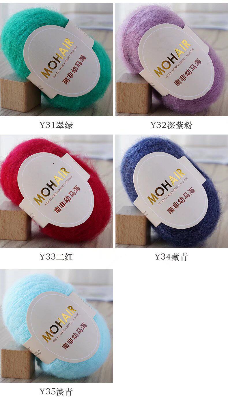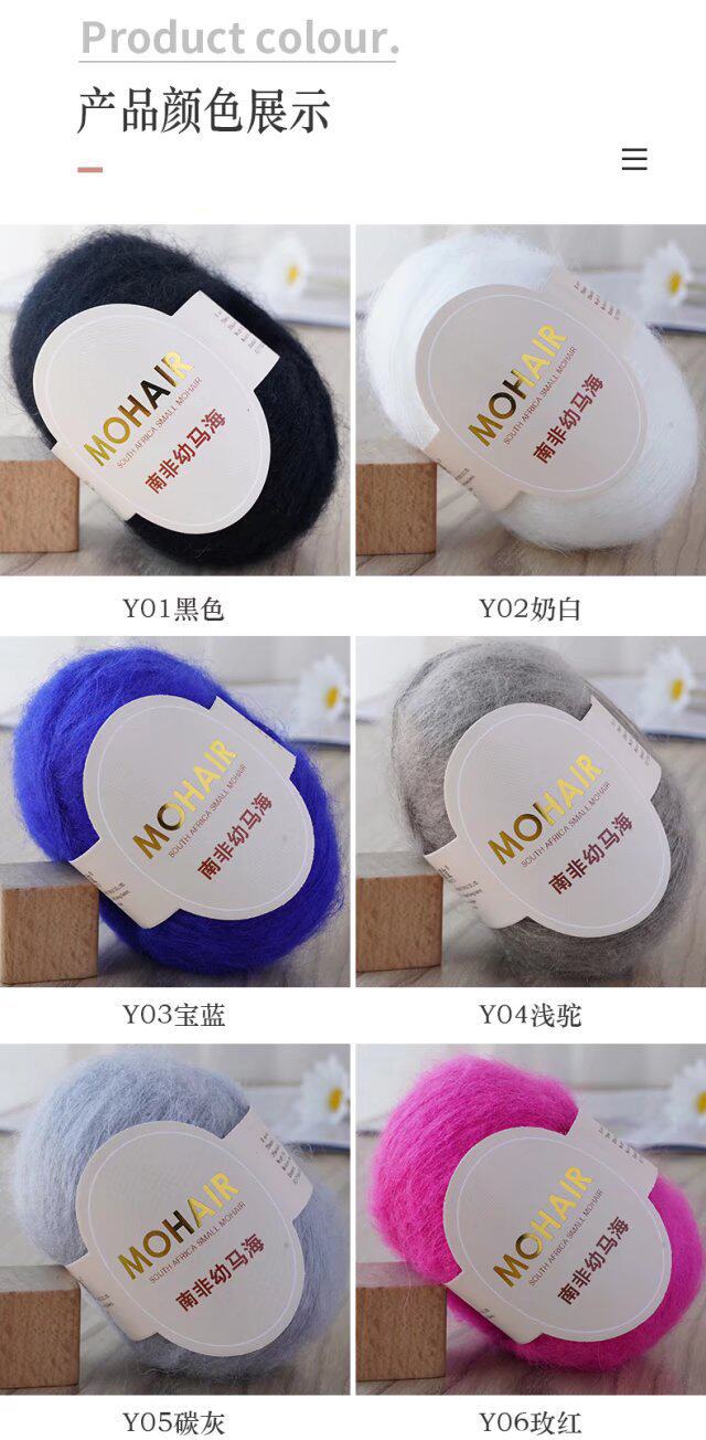| Specifications and models | * * * * *01 black*young mohair*25g*s twist (left twist)*mohair,* * * * *02 milk white*young mohair*25g*s twist (left twist)*mohair,* * * * *03 royal blue*young mohair*25g*s twist (left twist)*mohair,* * * * *04 light camel*young mohair*25g*s twist (left twist)*mohair,* * * * *05 charcoal gray*young mohair*25g*s twist (left twist)*mohair,* * * * *06 rose red*young mohai*25g*s twist (left twist)*mohair,* * * * *07 chicken yellow*young horse hair*25g*s twist (left twist)*mohair,* * * * *08 meat powder*young mohair*25g*s twist (left twist)*mohair,* * * * *09 orange* young mohair*25g*s twist (left twist)*mohair,* * * * *10 caramel*young mohair*25g*s twist (left twist)*mohair,* * * * *11 grape purple* young mohair*25g*s twist (left twist)*mohair,* * * * *12 gray powder*young mohair*25g*s twist (left twist)*mohair,* * * * * 13m white*young mohair*25g*s twist (left twist)*mohair,* * * * *14 khaki*young mohair*25g*s twist (left twist)*mohair,* * * * *15 light pink*young mohair*25g*s twist (left twist)*mohair,* * * * *16 lemon yellow*young mohair*25g*s twist (left twist)*mohair,* * * * *17 green gray*young mohair*25g*s twist (left twist)*mohair,* * * * *18 xuan red*young pony hair*25g*s twist (left twist)*mohair,* * * * *19 deep navy blue*young mohair*25g*s twist (left twist)*mohair,* * * * *20 big red*young mohair*25g*s twist (left twist)*mohair,* * * * *21 turmeric*young mohair*25g*s twist (left twist)*mohair,* * * * *22 purple red*young mohair*25g*s twist (left twist)*mohair,* * * * *23 autumn fragrant green*young mohair*25g*s twist (left twist)*mohair,* * * * *24 wine red*young mohair*25g*s twist (left twist)*mohair,* * * * *25 dark green*young mohai*25g*s twist (left twist)*mohair,* * * * *26 white gray*young mohair*25g*s twist (left twist)*mohair,* * * * *27 light gray*young mohair*25g*s twist (left twist)*mohair,* * * * *28 medium gray*young mohair*25g*s twist (left twist)*mohair,* * * * *29 dark gray*young mohair*25g*s twist (left twist)*mohair,* * * * *30 lotus root purple*young mohai*25g*s twist (left twist)*mohair,* * * * *31 emerald green*young mohai*25g*s twist (left twist)*mohair,* * * * *32 deep purple pink*young mohair*25g*s twist (left twist)*mohair,* * * * *33 erhong*young mohair*25g*s twist (left twist)*mohair,* * * * *34 navy*young mohair*25g*s twist (left twist)*mohair,* * * * *35 light green*young mohair*25g*s twist (left twist)*mohair,* * * * *37 coffee*young mohair*25g*s twist (left twist)*mohair,* * * * *38 violet*young mohair*25g*s twist (left twist)*mohair,* * * * *39 haze blue*young mohair*25g*s twist (left twist)*mohair,* * * * *40 light fog blue*young mohair*25g*s twist (left twist)*mohair,* * * * *41 leather powder*young mohair*25g*s twist (left twist)*mohair,* * * * *42 water pink green*young mohair*25g*s twist (left twist)*mohair,* * * * *43 lilac purple*young mohair*25g*s twist (left twist)*mohair,* * * * *44 cloud water blue*young mohair*25g*s twist (left twist)*mohair,* * * * *45 late wave blue*young mohair*25g*s twist (left twist)*mohair,* * * * *46 klein blue* young mohair*25g*s twist (left twist)*mohair,* * * * *47 cranberry*young mohair*25g*s twist (left twist)*mohair,* * * * *48 bean green*young mohair*25g*s twist (left twist)*mohair,* * * * *49 patina*young mohair*25g*s twist (left twist)*mohair,* * * * *50 chestnut brown*young mohair*25g*s twist (left twist)*mohair,* * * * *51 silver gray*young mohair*25g*s twist (left twist)*mohair,* * * * *52 sakura pink*young mohair*25g*s twist (left twist)*mohair,* * * * *53 morandi*young mohai*25g*s twist (left twist)*mohair,* * * * *54 rose pink*young mohair*25g*s twist (left twist)*mohair |