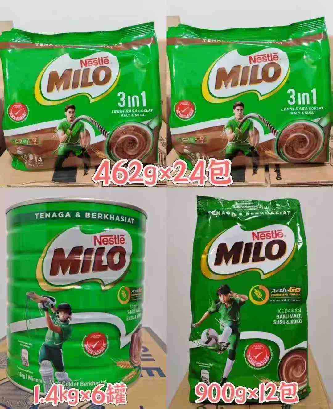 | Packaging specifications | Nestle milo malt chocolate prepared cocoa powder 1.4kg*6 cans, please take multiples of 6,Nestle milo malt chocolate prepared cocoa powder 900gx12 packs, please take multiples of 12,Milo bag 462g (14 pieces)*6 packs/set, please take multiples of 6,Nestle milo malt chocolate prepared cocoa powder 400g*6 cans/set, please take multiples of 6 |