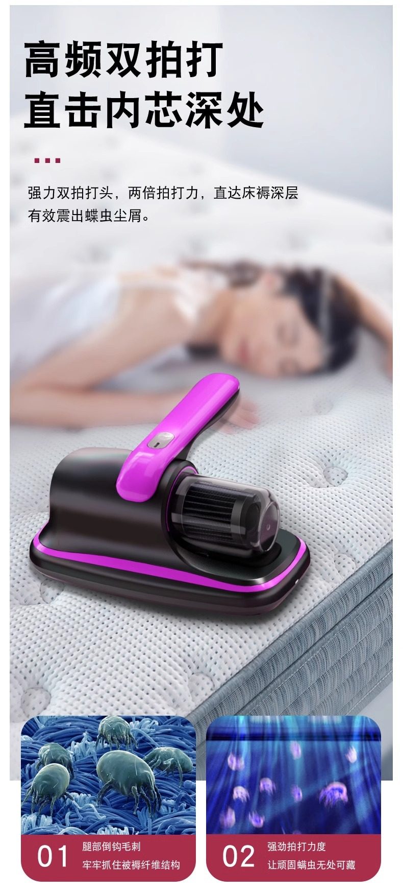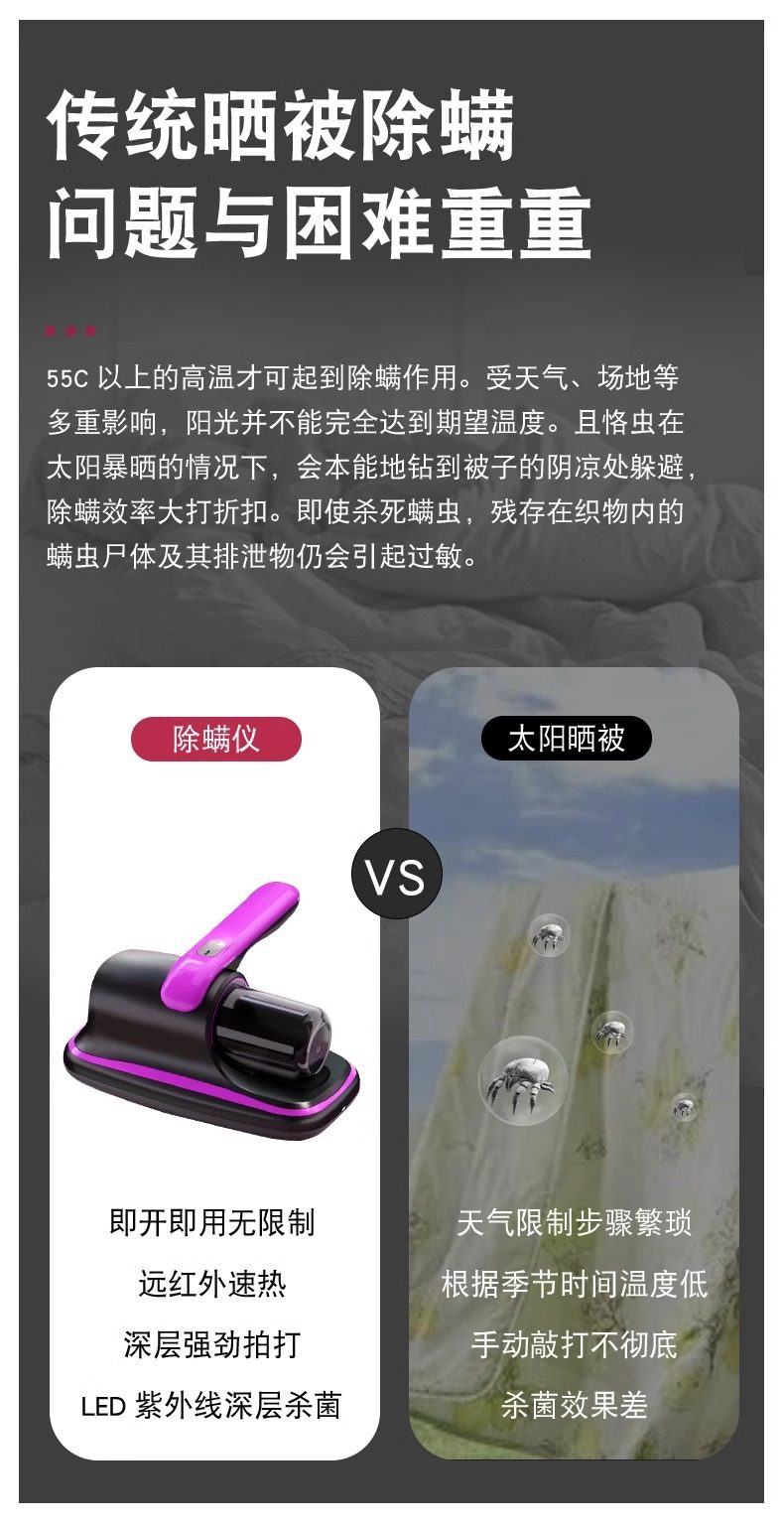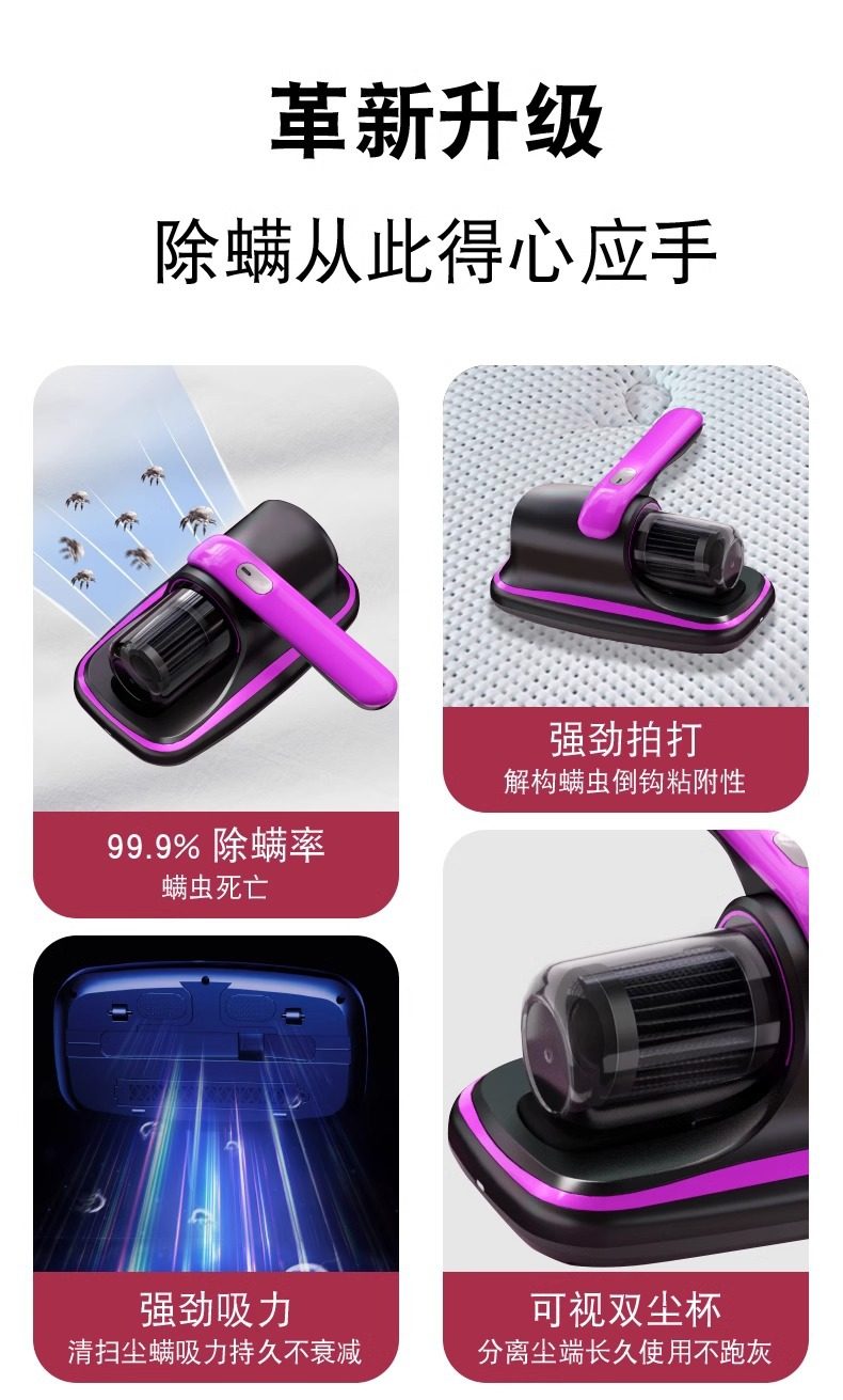| Color | Purple [high suction power, true mite removal] uv ultraviolet sterilization + mite removal rate 99.9% + super suction power + powerful patting + wireless and portable,Gold [high suction power, true mite removal] uv ultraviolet sterilization + mite removal rate 99.9% + super suction power + powerful patting + wireless and portable,Rose red [high suction power, true mite removal] uv ultraviolet sterilization + mite removal rate 99.9% + super suction power + powerful patting + wireless and portable |