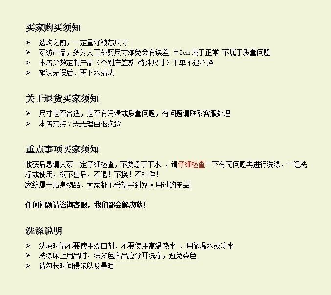 | Size specifications | 150x200cm single quilt cover,180x220cm single quilt cover,200x230cm single quilt cover,1.5m piece set (quilt cover 150x200),1.9m piece set (quilt cover 150x200),2.2m piece set (quilt cover 180x220),2.4m piece set (quilt cover 200x230) |