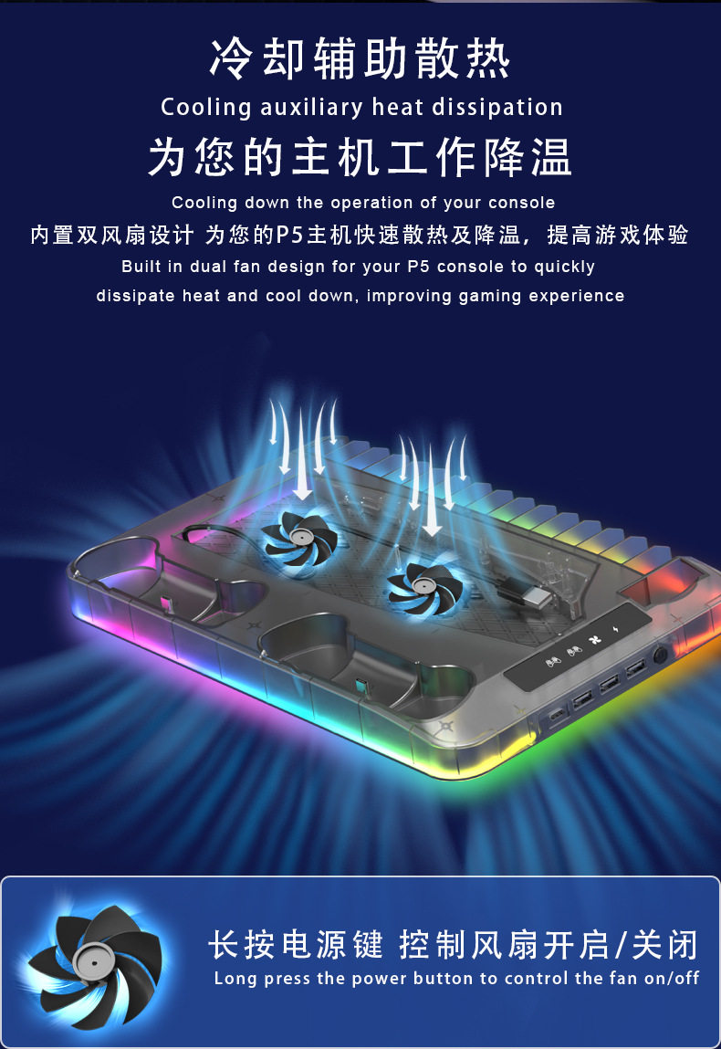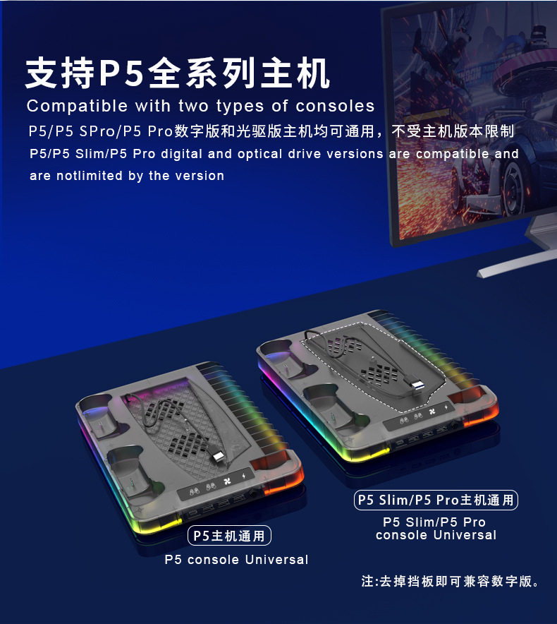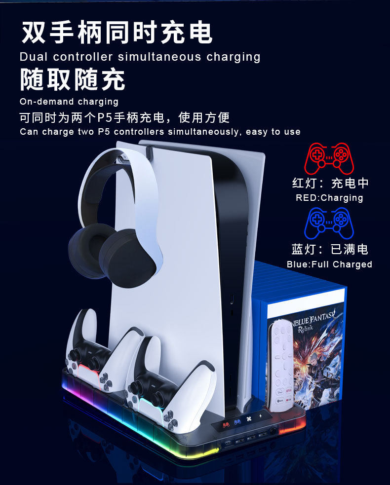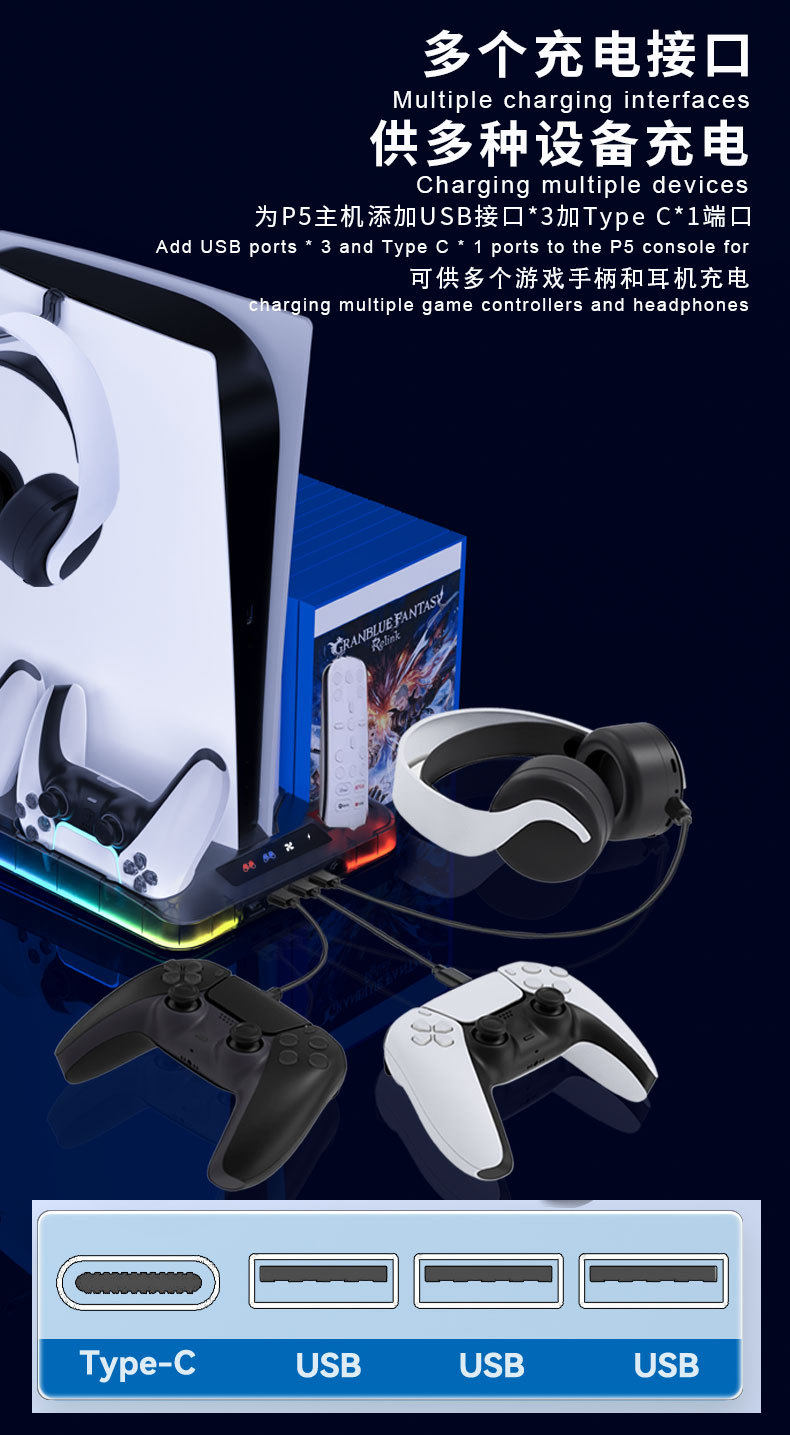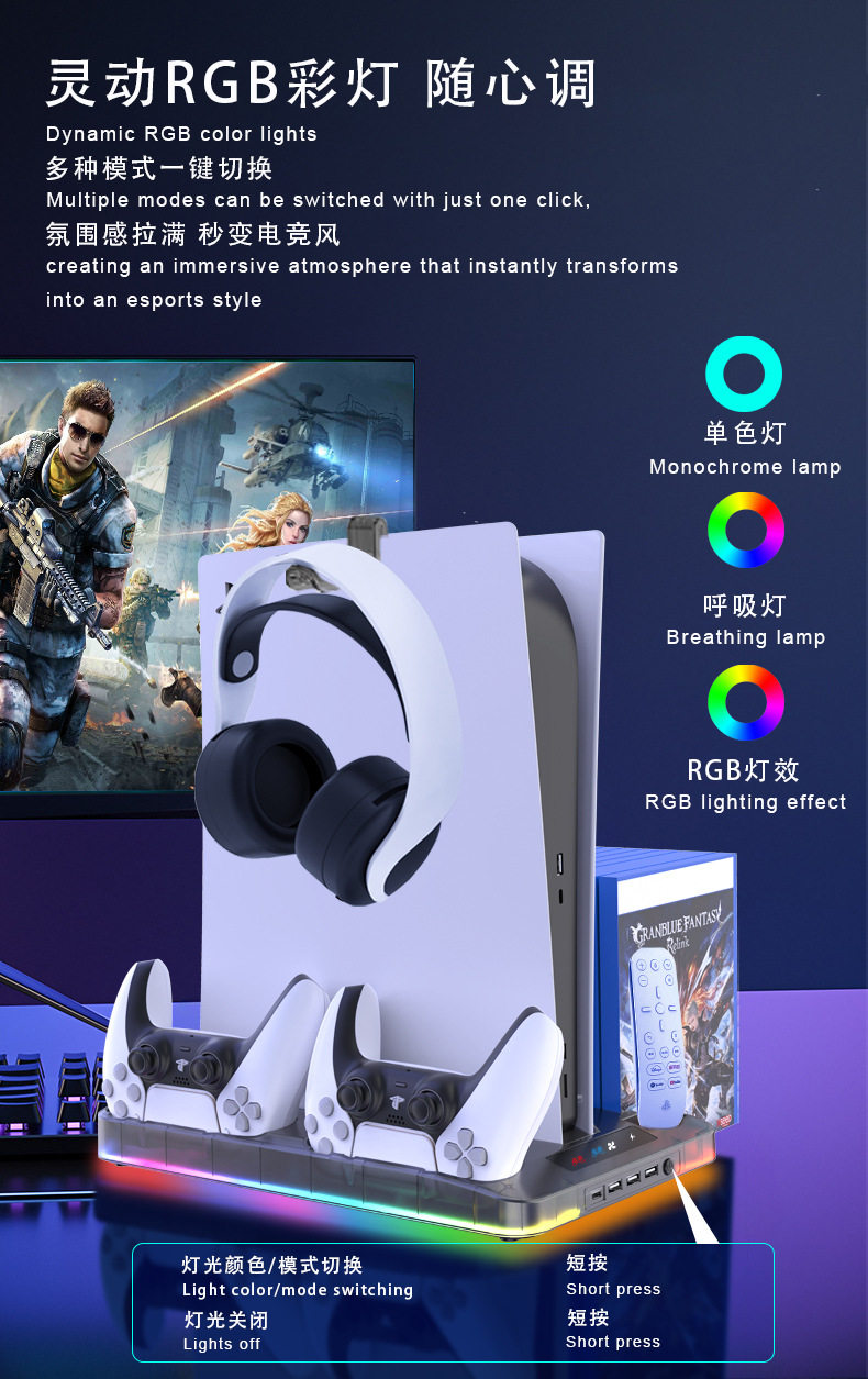 Ps5 Slim Cooling Base Ps5 Controller Charging Stand with Grb Light Game Disc Headphone Storage Cooling Base