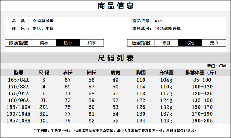 | Down filling amount | 100g (inclusive)-150g (exclusive) |