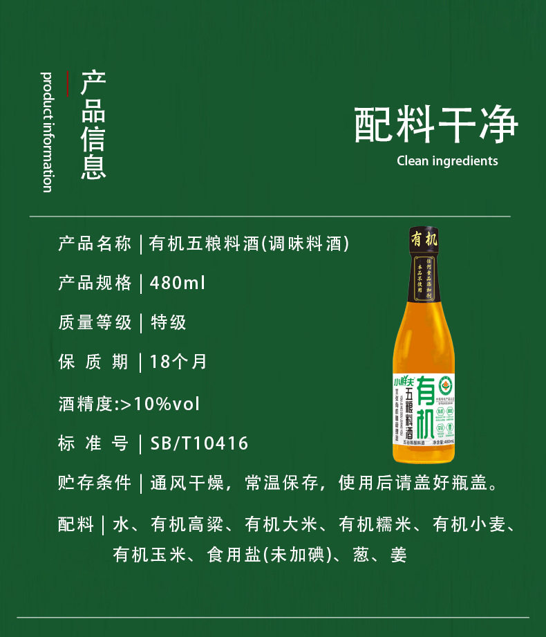 | Item number | Xiaoxianfu organic five-grain cooking wine 480ml |
