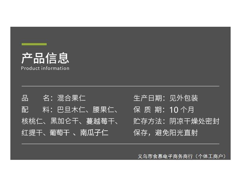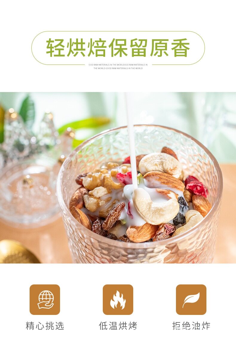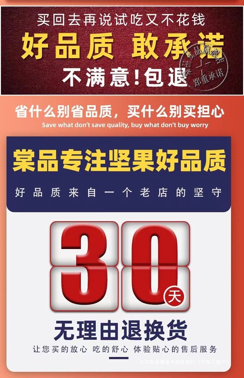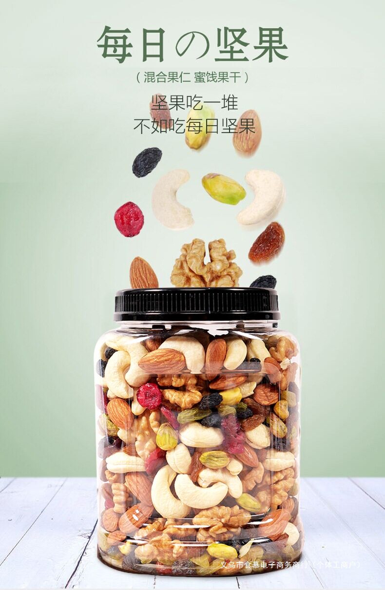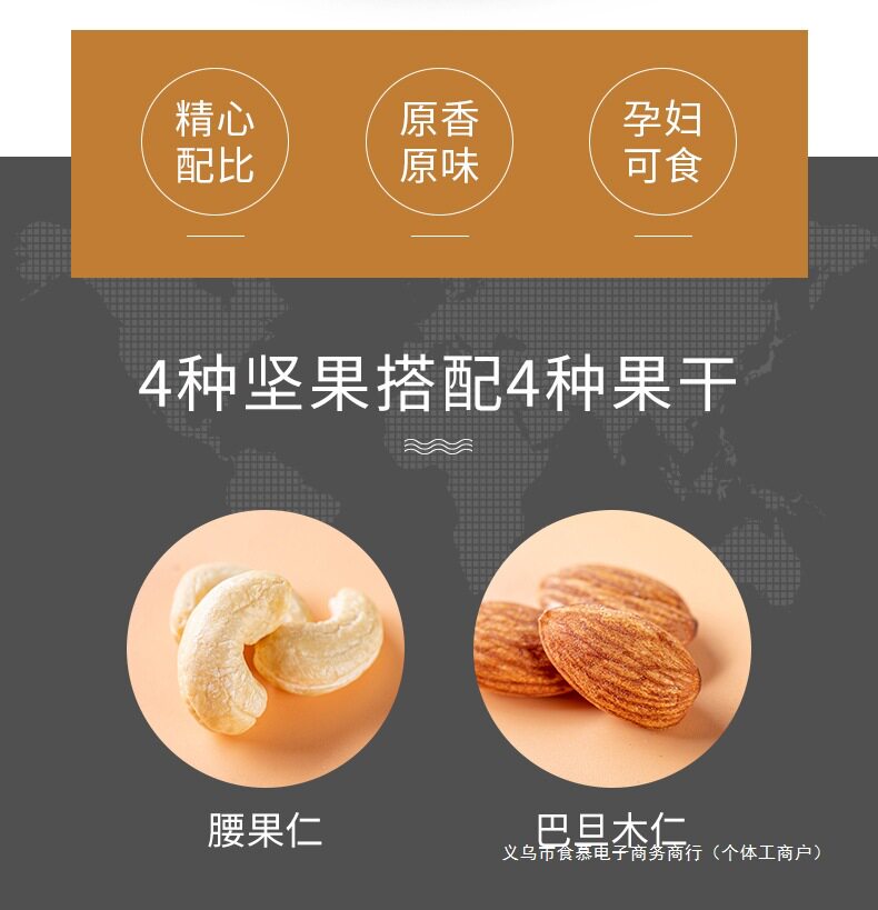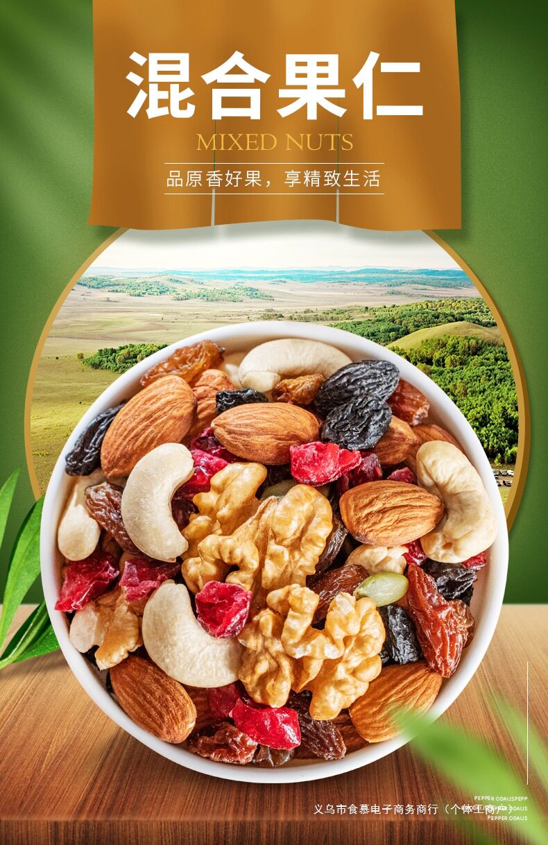 | Packaging specifications | [type a 8 kinds of nuts] 100g*1 bag (8 kinds of fresh nuts),[type a 8 kinds of nuts] 250g*2 bags (8 kinds of fresh nuts),[type b high-end nut ratio] 250g*2 bags (selected nuts in each type),[type a + type b combination pack] type a 250g + type b 250g (more expensive is much better),[buy 0.5kg and get half a catty free] type a 8 kinds of nuts 250g*2 bags (plus one bag of the same style, 3 bags in total),[buy 0.5kg and get half a catty free] type b high-end nuts with 250g*2 bags (plus one bag of the same style, 3 bags in total),[type a 8 kinds of nuts] 500g exquisite large can (8 kinds of fresh nuts),[type b high-end nut ratio] 500g exquisite large can (selected nuts in each type),[type a 8 kinds of nuts] 250g*1 bag (8 kinds of fresh nuts) |