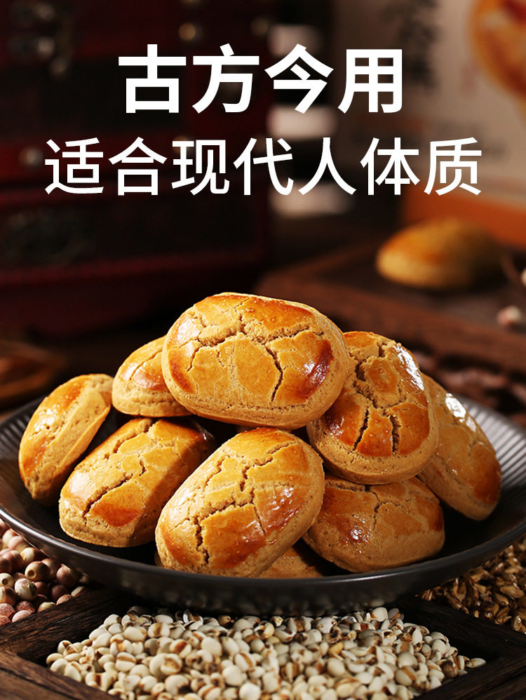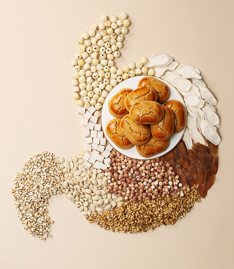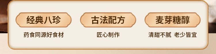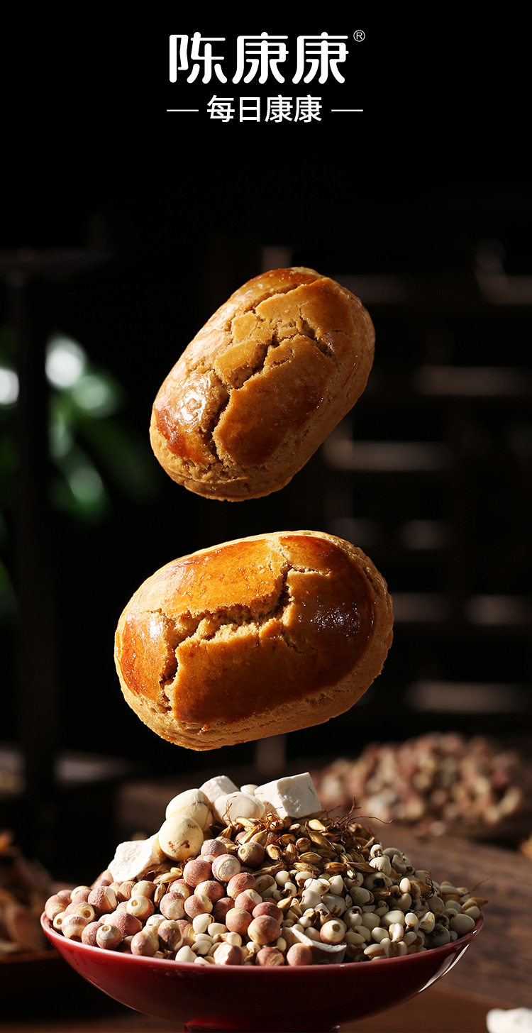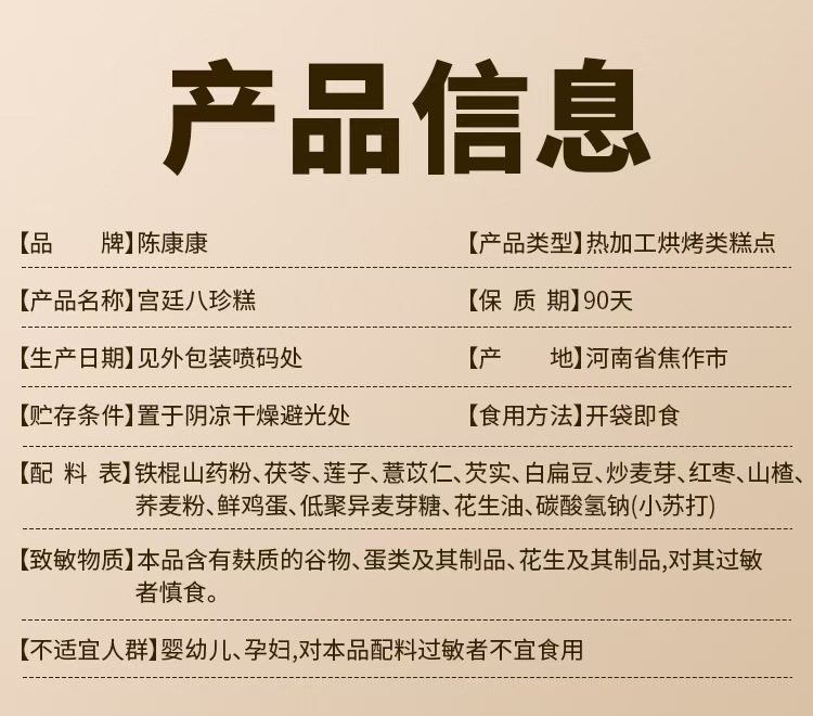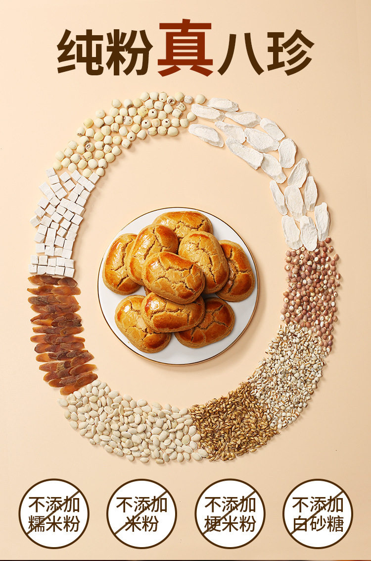 | Raw materials and ingredients | Ingredients list: iron bar yam powder, poria cocos, lotus seeds, coix seeds, gorgon fruit, white lentils, fried malt, red dates, hawthorn, fresh eggs, maltitol, peanut oil |