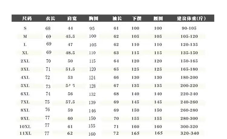 | Size | M【 50-60kg 】,L【 55-60kg 】,Xl【 62.5-67.5kg 】,2xl【 67.5-75kg 】,3xl【 77.5-87.5kg 】,4xl【 87.5-95kg 】,5xl【 95-105kg 】,6xl【 105-115kg 】,7xl【 117.5-127.5kg 】for,8xl【 127.5-140kg 】,9xl【 140-150kg 】,10xl【300-320】,11xl【 160-175kg 】for |
