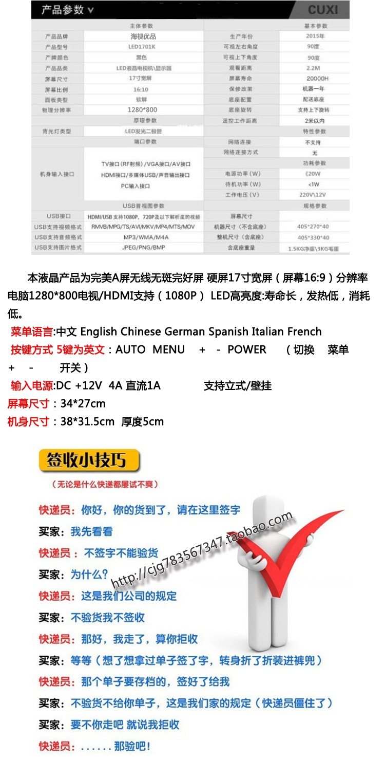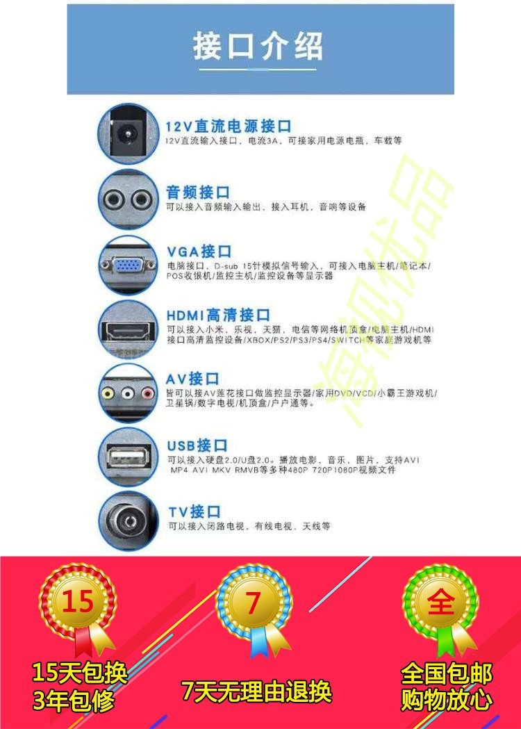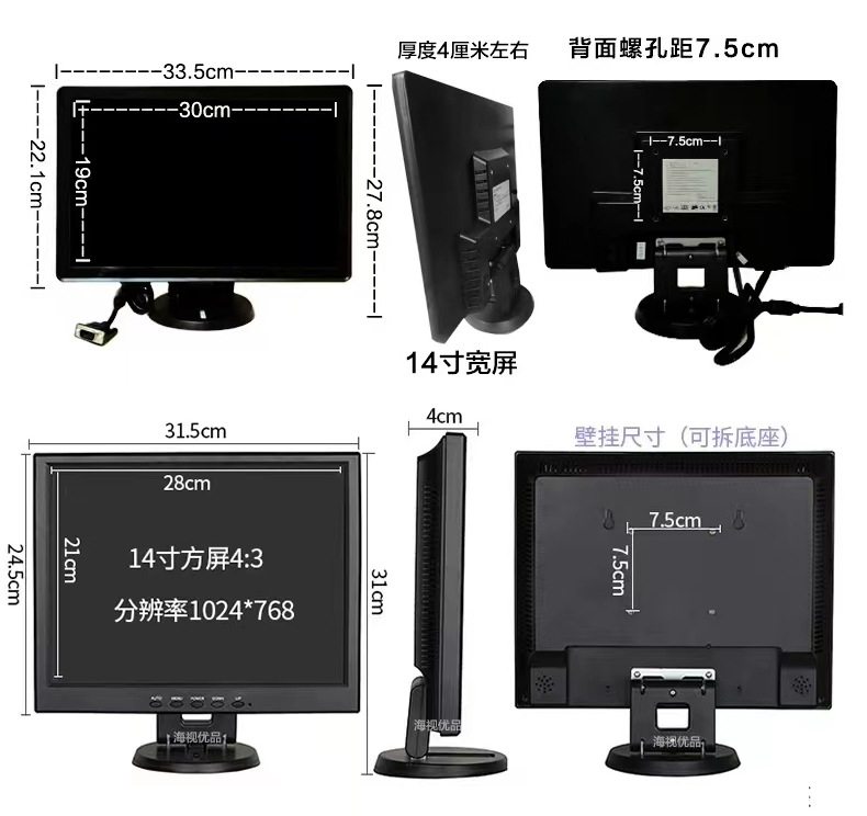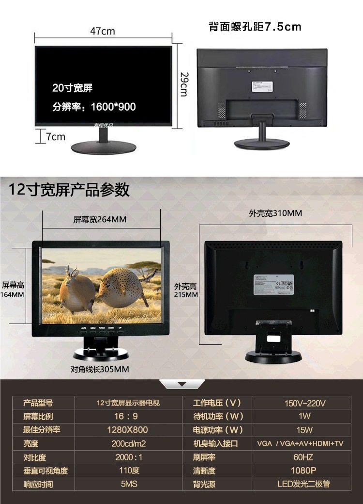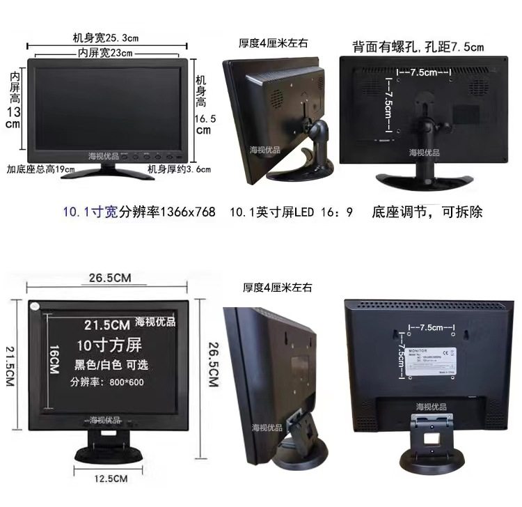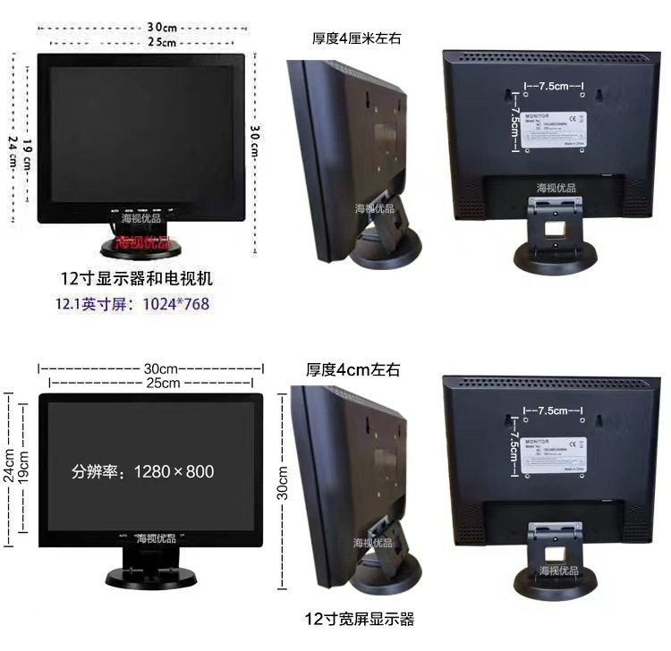 Color 12inch widescreen black (recommended) resolution 1280*800,10inch widescreen black (recommended) resolution 1366*768,10inch square screen black resolution 1024*768,14inch square screen black resolution 1024*768,12inch square screen black (industrial screen, high brightness) resolution 1024*768,15.6inch widescreen black resolution 1366*768,14inch wide screen black (for cashier monitoring only) resolution 1280*800,15inch square screen black (recommended) resolution 1024*768,17inch square screen black resolution 1280*1024,17inch widescreen black resolution 1440*900,19inch square screen black resolution 1280*1024,19inch widescreen black resolution 1440*900,20inch widescreen black resolution 1600*900,7inch car av monitor resolution 800*480