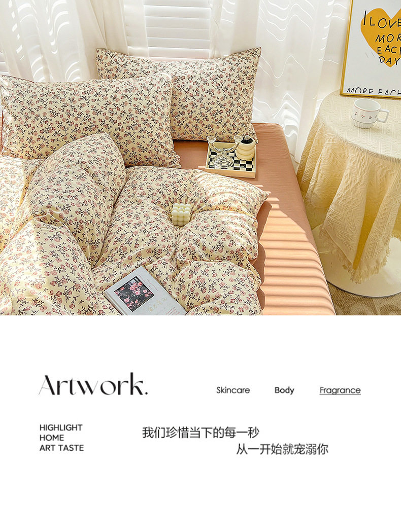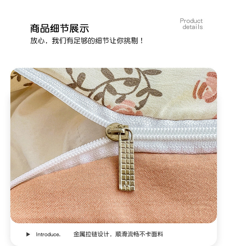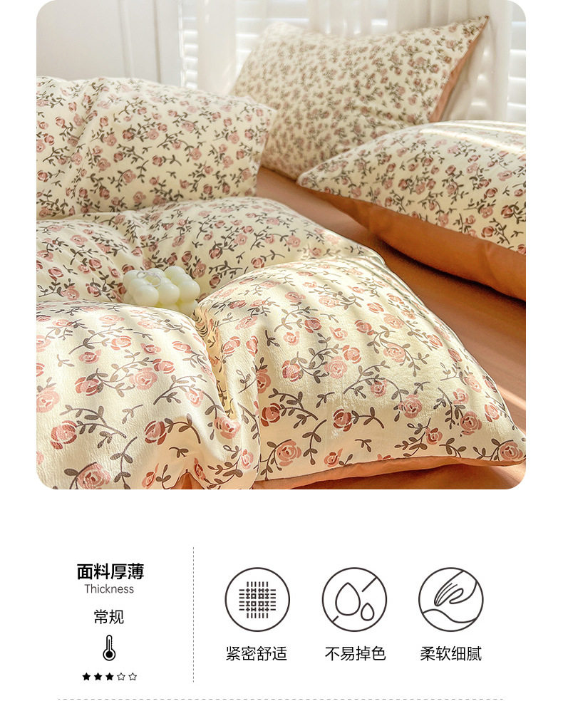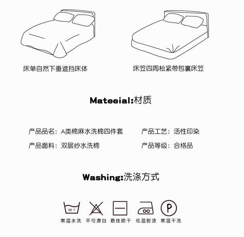 | Size specifications | 0.9-1.2m bed sheet three-piece set-quilt cover 150*200,1.2m bed sheet four-piece set-quilt cover 150*200,1.5-1.8m bed sheet four-piece set-quilt cover 180x220,1.5-1.8m bed sheet four-piece set-quilt cover 200*230,2.0m bed sheet four-piece set-quilt cover 220*240,1.5m fitted sheet set of four-quilt cover 200x230,1.8m fitted sheet set of four-quilt cover 200x230 |