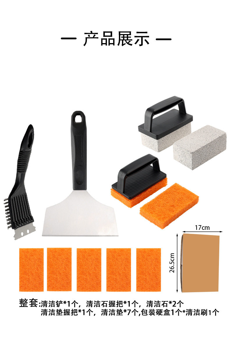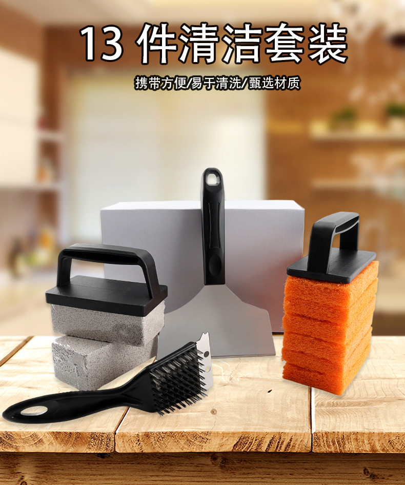 Specifications 13 piece cleaning set,Scouring pad,Scouring pad with handle,Cleaning stone,Cleaning stone with handle,Wire brush,Shovel