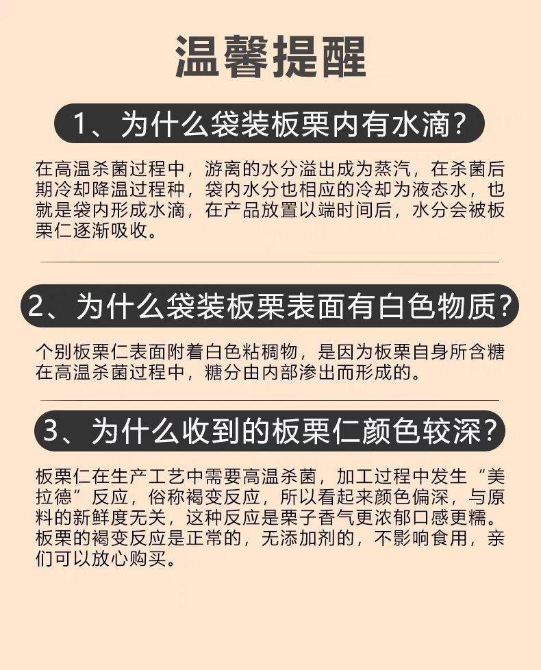 | Taste | 10 bags of chestnuts (about 250g) tasting pack,20 bags of chestnuts (about 500g) affordable package,32 bags of chestnuts (about 800g) family size,40 bags of chestnuts (about 1000g) super deal,Chestnut kernels 25g*50 packs |