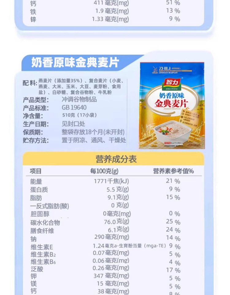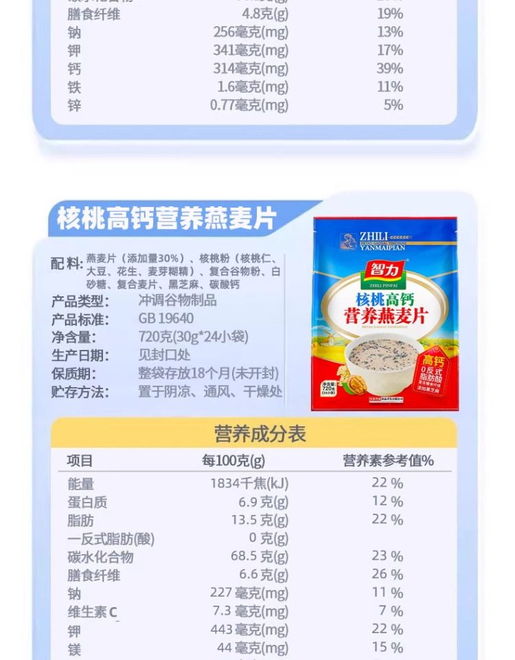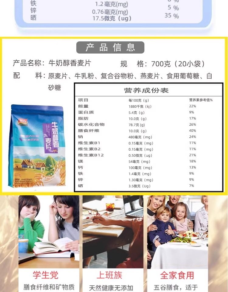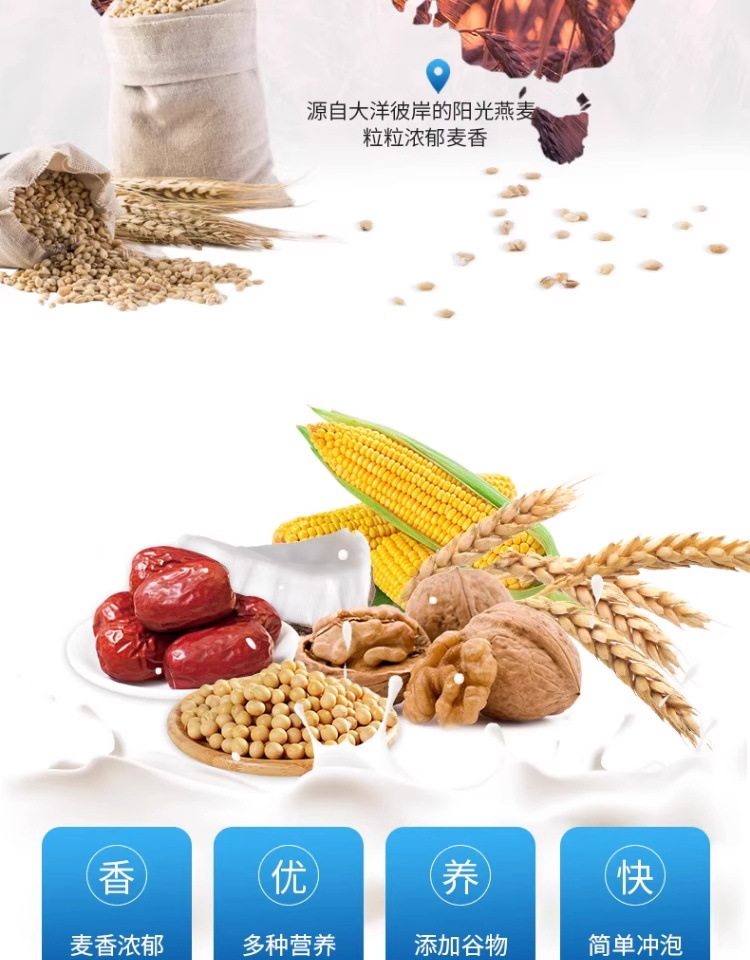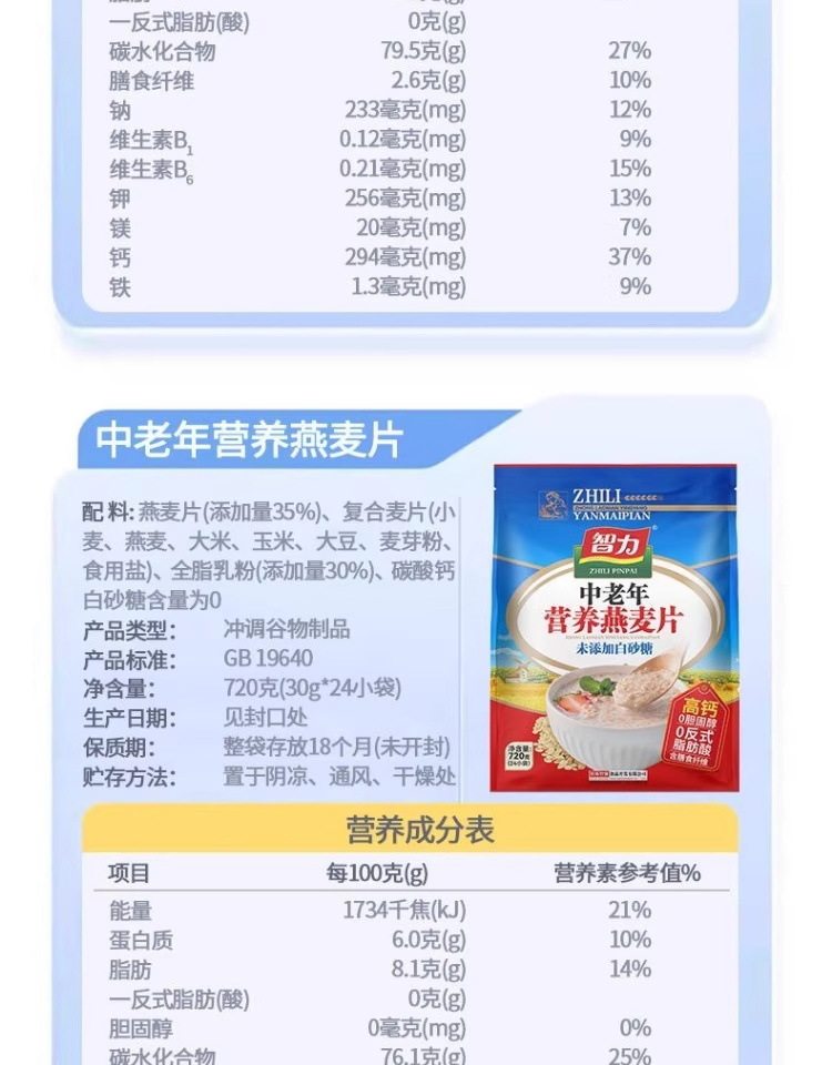| Packaging specifications | Milk and calcium cereal 720g,Nutritional cereal for middle-aged and elderly people 720g,Walnut and calcium cereal 720g,Milk mellow oatmeal 700g |