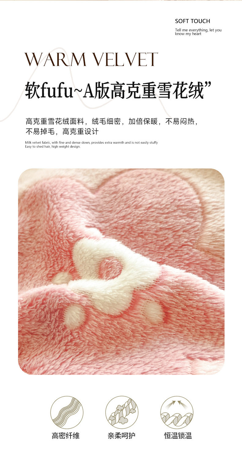 | Flower type | Love [warm snowflake velvet],Strawberry bunny [warm snowflake velvet],Strawberry love [warm snowflake velvet],Cute little bear [warm snowflake velvet],Spongebob squarepants [warm snowflake velvet],Language of flowers [warm snowflake velvet],Smart dog [warm snowflake velvet],Blue bear [warm snowflake velvet],Full house [warm snowflake velvet],Carrot rabbit [warm snowflake velvet],Cute dog life [warm snowflake velvet],Sweet orange [warm snowflake velvet],Sweetie bear [warm snowflake velvet],Tuan tuan yuan yuan [warm snowflake velvet],Puppy beibei [warm snowflake velvet],Cherry rabbit [warm snowflake velvet] |