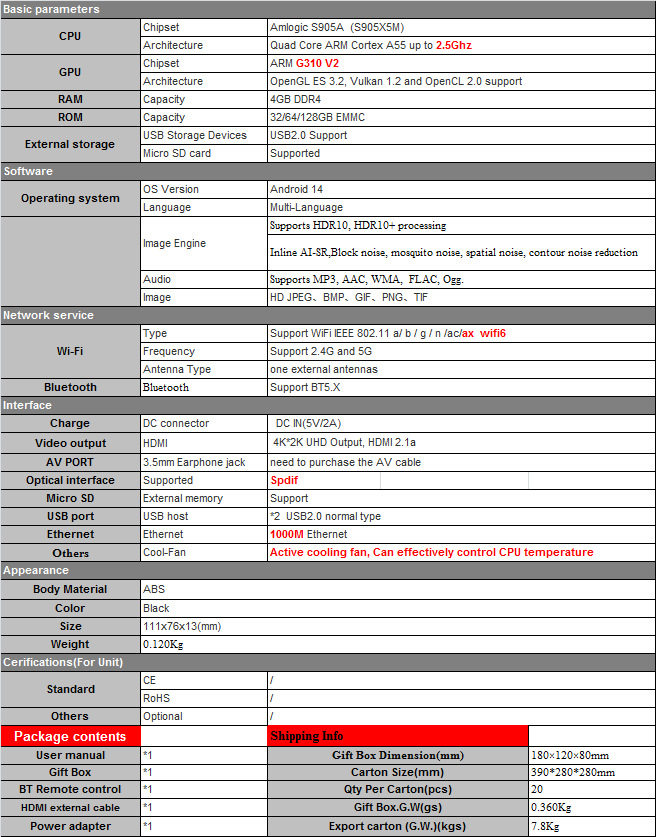 | Package list | Set-top box, power supply, hd cable, manual, color box |