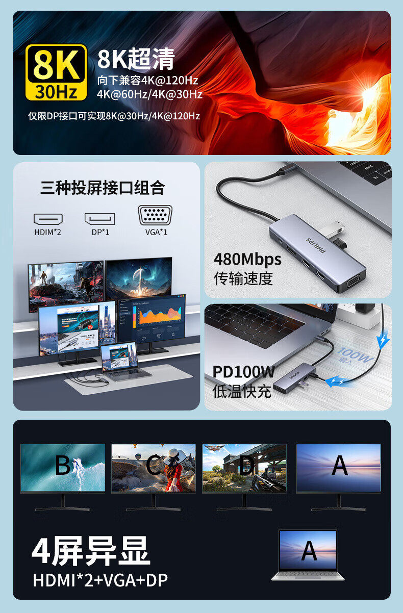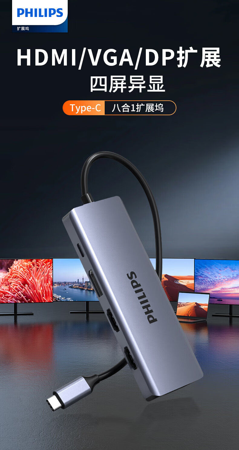 Philips Type-C Docking Station Network Cable Port Usb-C to HDMI Adapter Usb3.0 Computer Converter