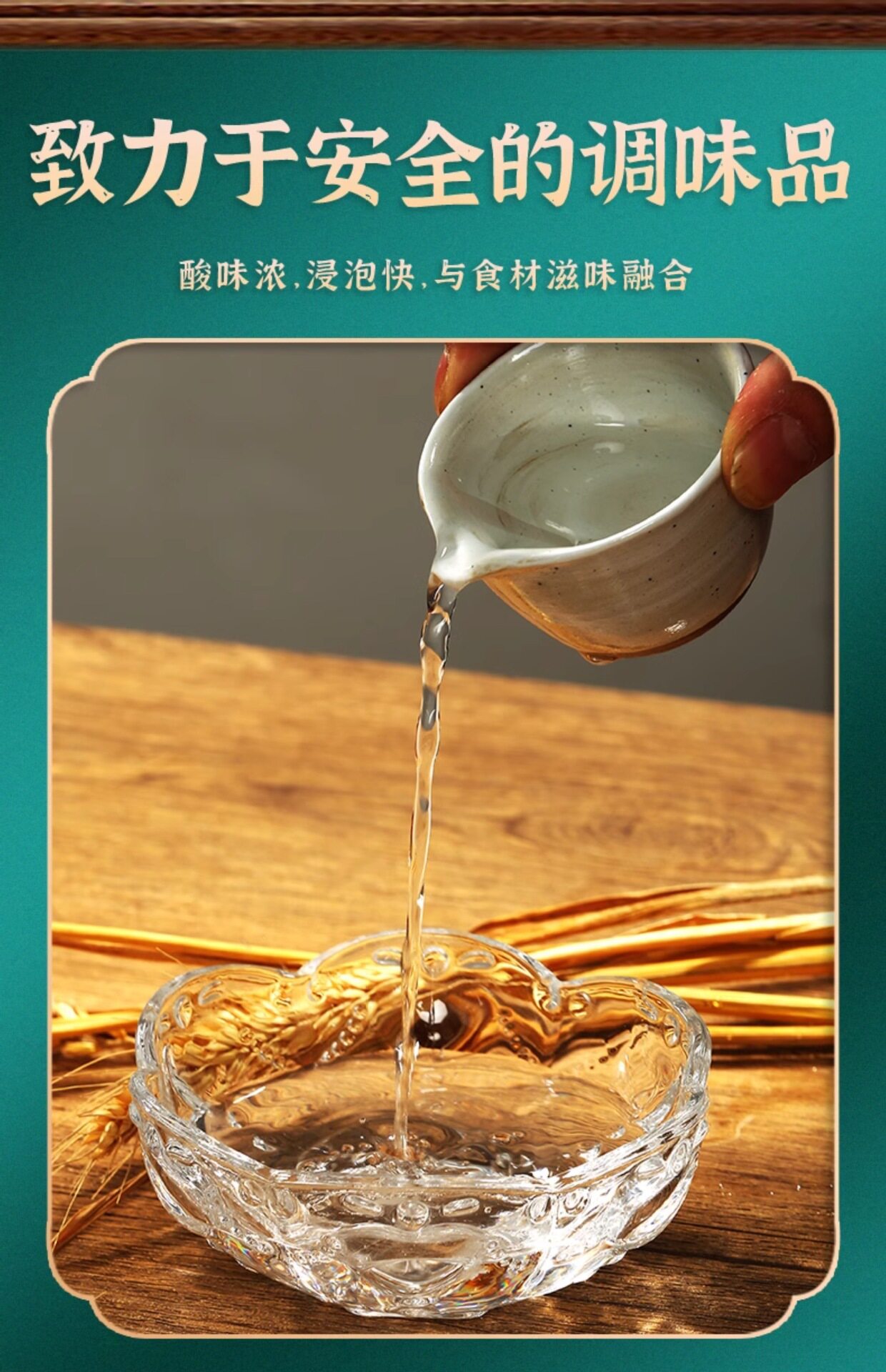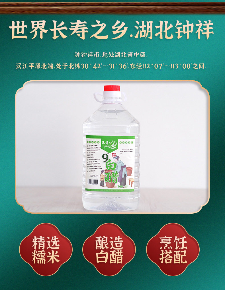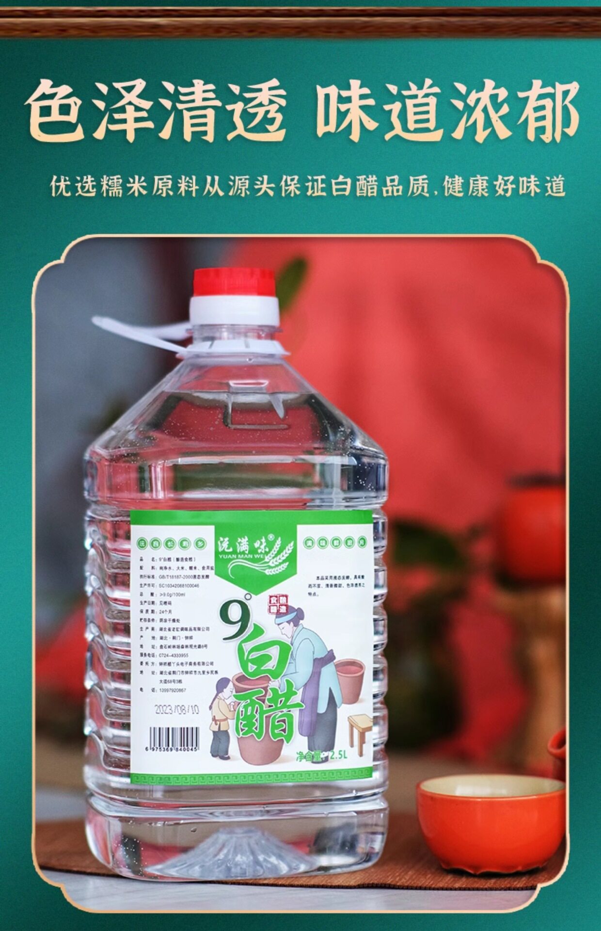 | Packaging specifications | 9 degree white vinegar 800ml*1 bottle,9 degree white vinegar 800ml*2 bottles,9 degree white vinegar 800ml*3 bottles,9 degree white vinegar 2500ml*1 barrel,9 degree white vinegar 2500ml*2 barrels,9 degree white vinegar 4500ml*1 barrel |