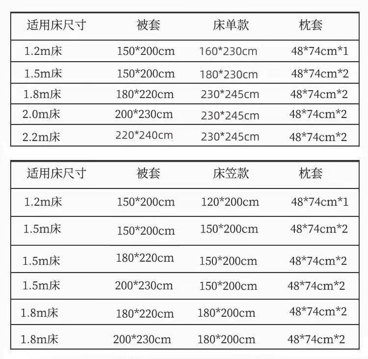 | Size specifications | 1.2m dormitory bed three-piece set [quilt cover 150*200],1.2m bed sheet four-piece set [quilt cover 150*200],1.5m bed sheet four-piece set [quilt cover 150*200],1.2m fitted sheet three-piece set [quilt cover 150*200],1.5m bed sheet four-piece set [quilt cover 180*220],1.5m bed sheet four-piece set [quilt cover 200*230],1.8m bed sheet four-piece set [quilt cover 200*230],1.2m fitted sheet set of four [quilt cover 150*200],1.8m fitted sheet set of four [quilt cover 180*220],1.5m fitted sheet set of four [quilt cover 150*200],1.8m fitted sheet set of four [quilt cover 200*230],1.8m fitted sheet set of four [quilt cover 220*240],2.0m bed sheet four-piece set [quilt cover 200*230] |