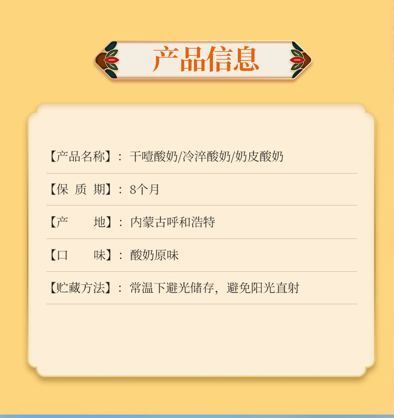 | Packaging specifications | Dry yogurt 250g,Cold brew yogurt 250g,Milk skin yogurt 250g,Dry choke yogurt bulk 2.5kg,Cold brew yogurt bulk 2.5kg,Milk skin yogurt 2.5kg |