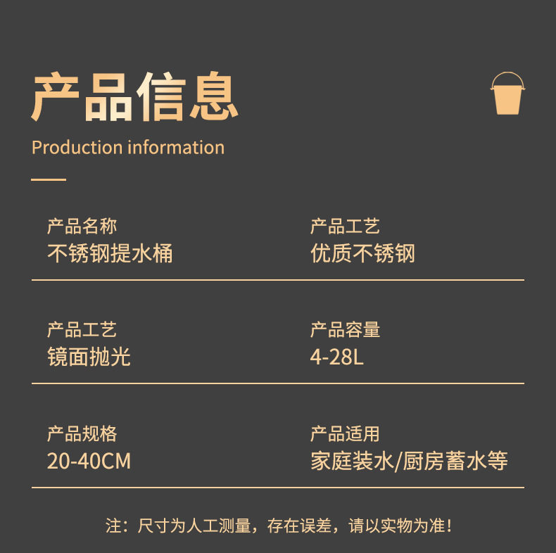 | Capacity | 20cm bucket 4l waterless spoon,22cm bucket 5l,24cm bucket 6l,26cm bucket 7l,28cm bucket 8l,30cm bucket 10l,32cm bucket 12l,34cm bucket 16l,36cm bucket 20l,38cm bucket 24l,[with lid] 20cm bucket 4l waterless spoon,[with lid] 22cm bucket 5l,[with lid] 24cm bucket 6l,[with lid] 26cm bucket 7l,[with lid] 28cm bucket 8l,[with lid] 30cm bucket 10l,[with lid] 32cm bucket 12l,[with lid] 34cm bucket 16l,[with lid] 36cm bucket 20l,[with lid] 38cm bucket 24l,20cm bucket 4l waterless spoon..,20cm bucket 4l waterless spoon. |