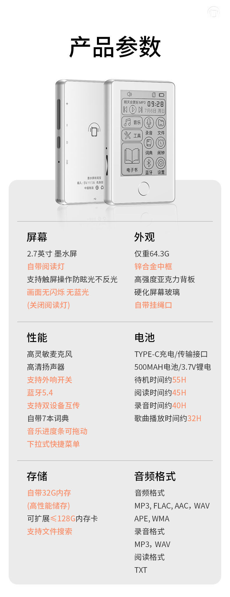 | Memory capacity | [default download] 2,000 popular novels/500 vip songs,[no need to download novels and songs] |