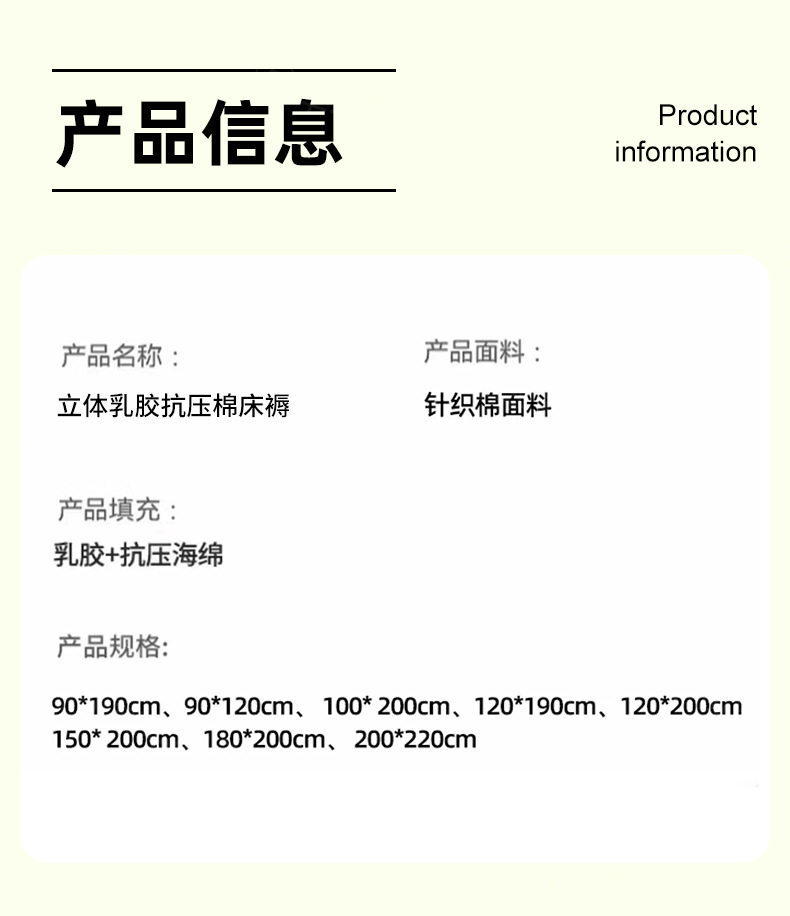 | Size specifications | 80*190cm [natural latex supports waist and protects spine, refuses to collapse],90*190cm [natural latex supports waist and protects spine, refuses to collapse],90*200cm [natural latex supports waist and protects spine, refuses to collapse],100*200cm [natural latex supports waist and protects spine, refuses to collapse],120*190cm [natural latex supports waist and protects spine, refuses to collapse],120*200cm [natural latex supports waist and protects spine, refuses to collapse],150*190cm [natural latex supports waist and protects spine, refuses to collapse],150*200cm [natural latex supports waist and protects spine, refuses to collapse],180*200cm [natural latex supports waist and protects spine, refuses to collapse] |