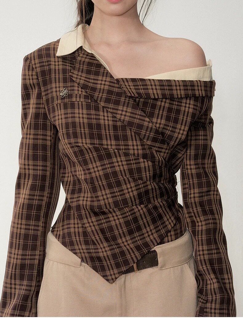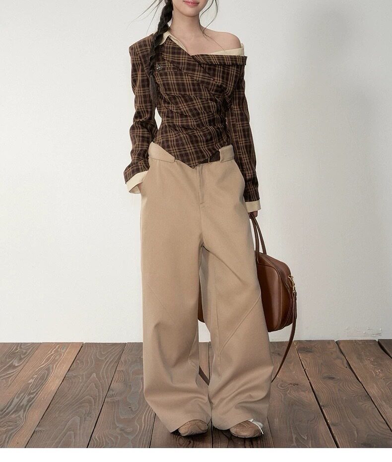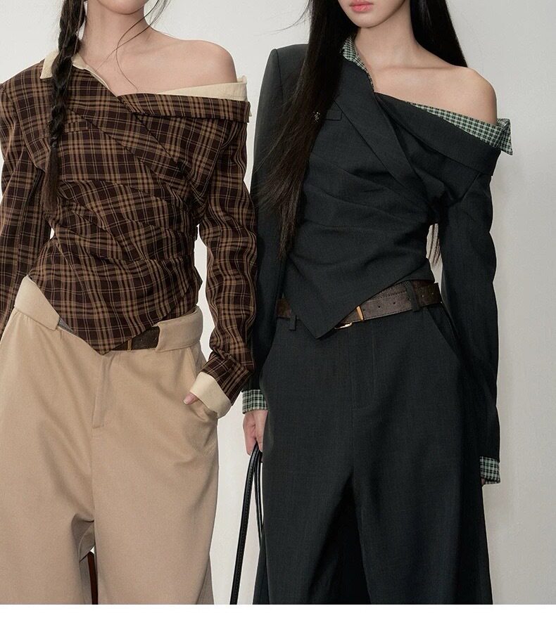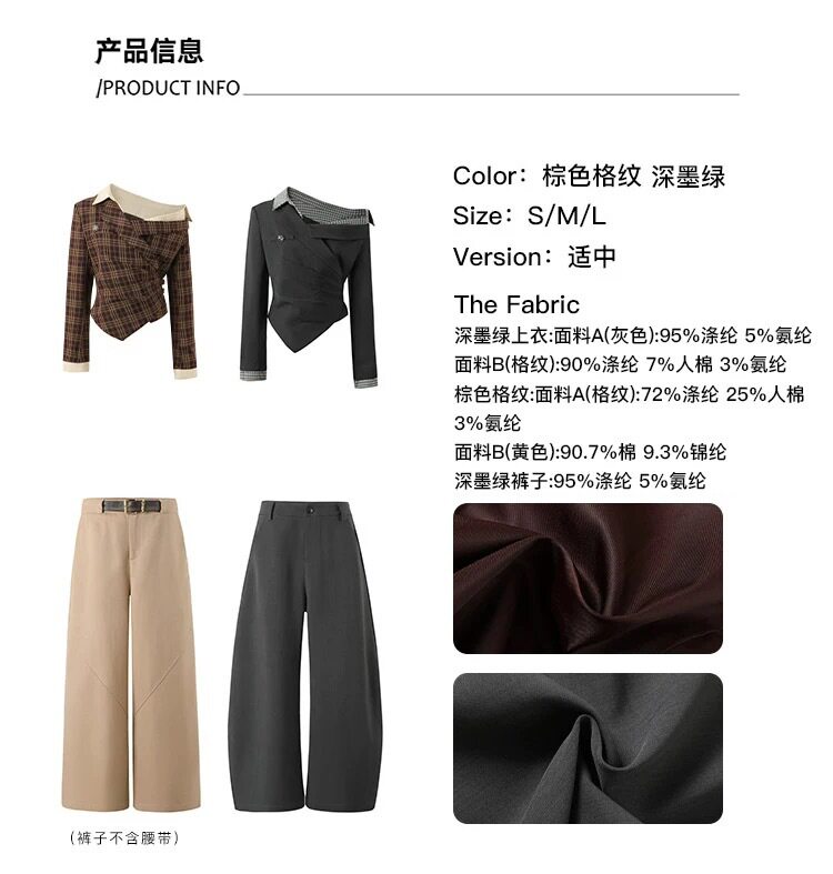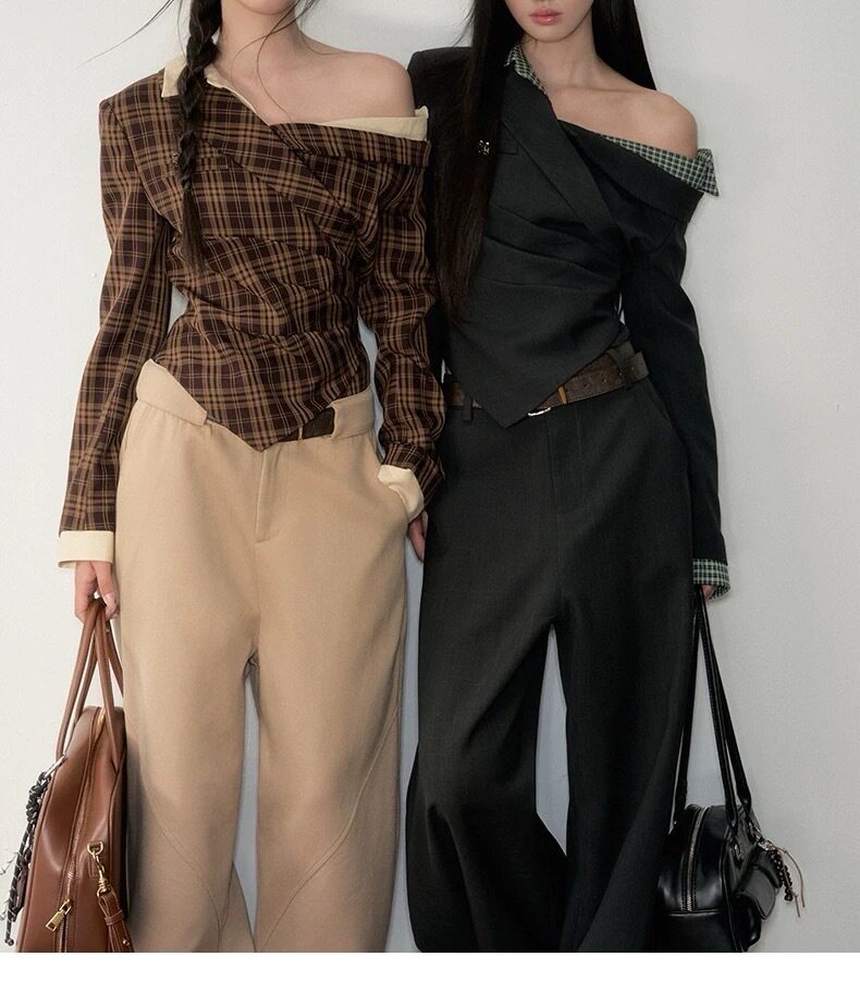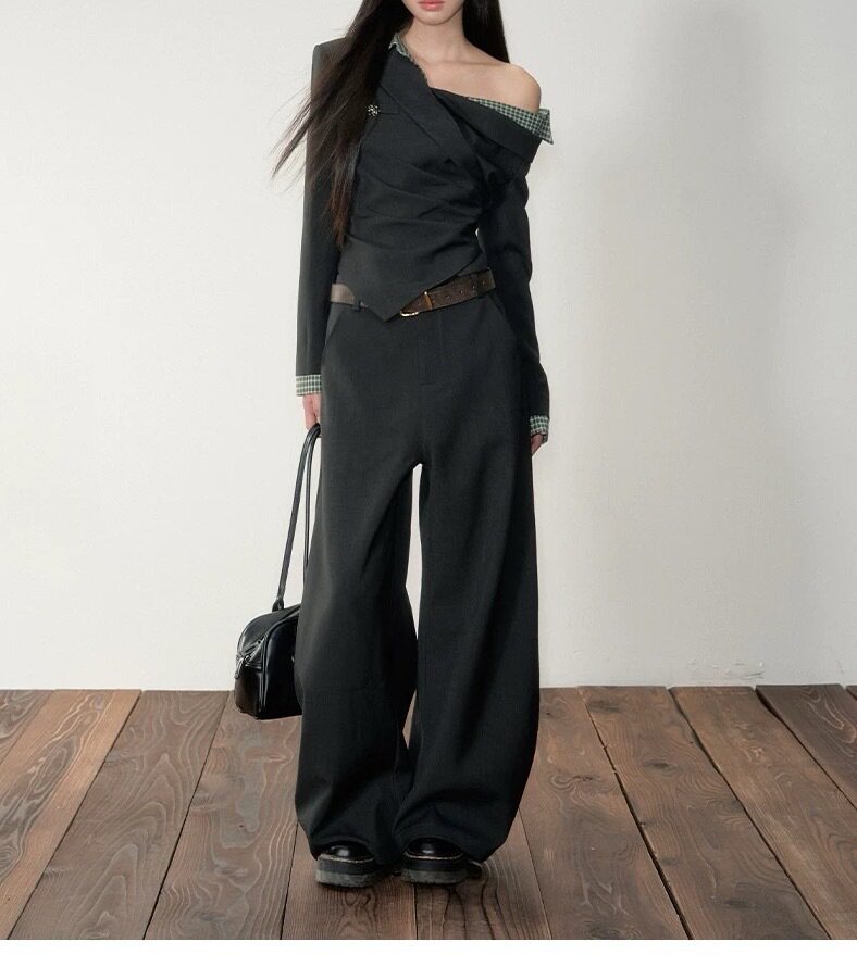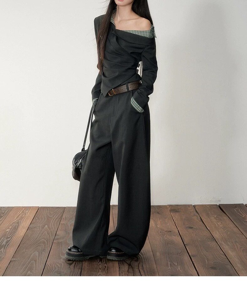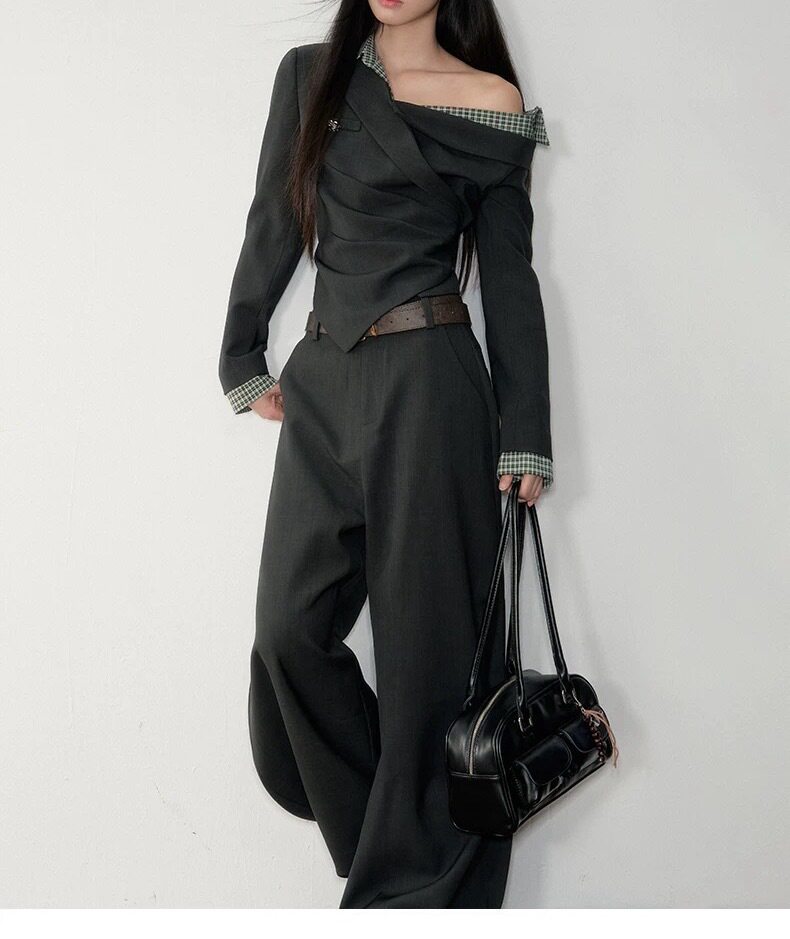 Soote Season Original Korean Fake Two-Piece Waist-Cinching Slanted Shoulder Suit Top High-End Two-Piece Suit Pants