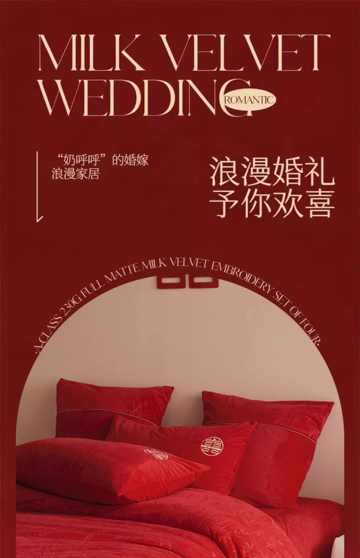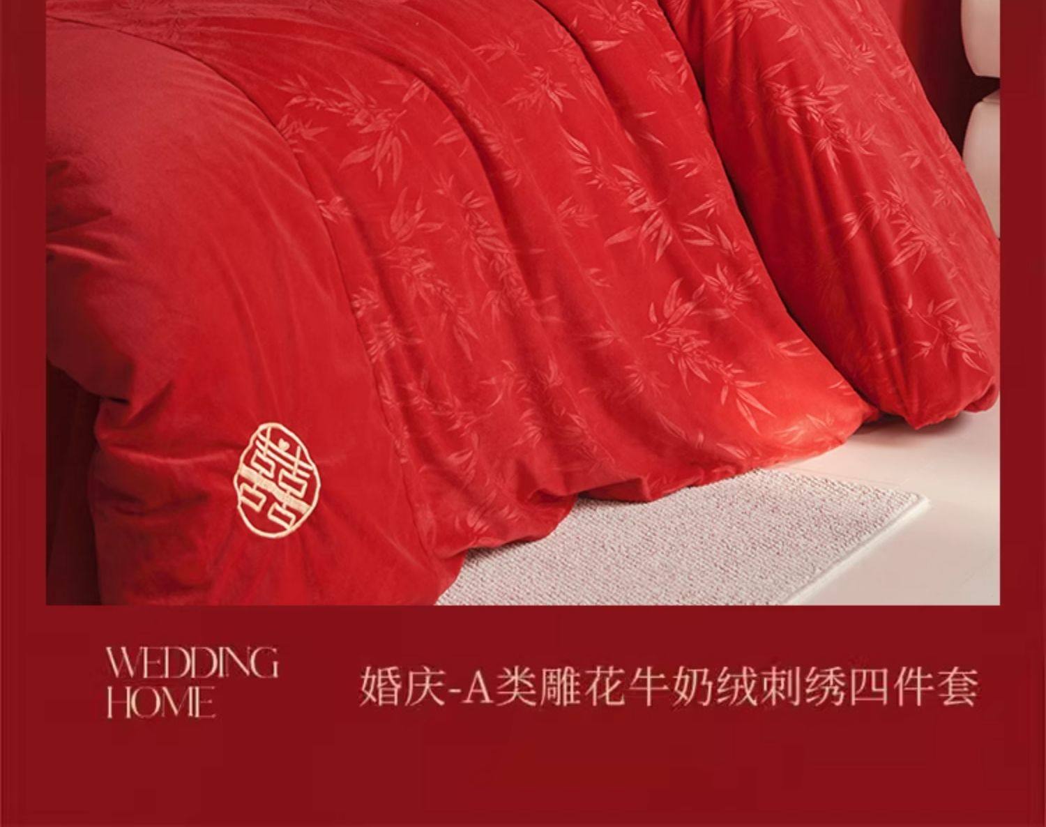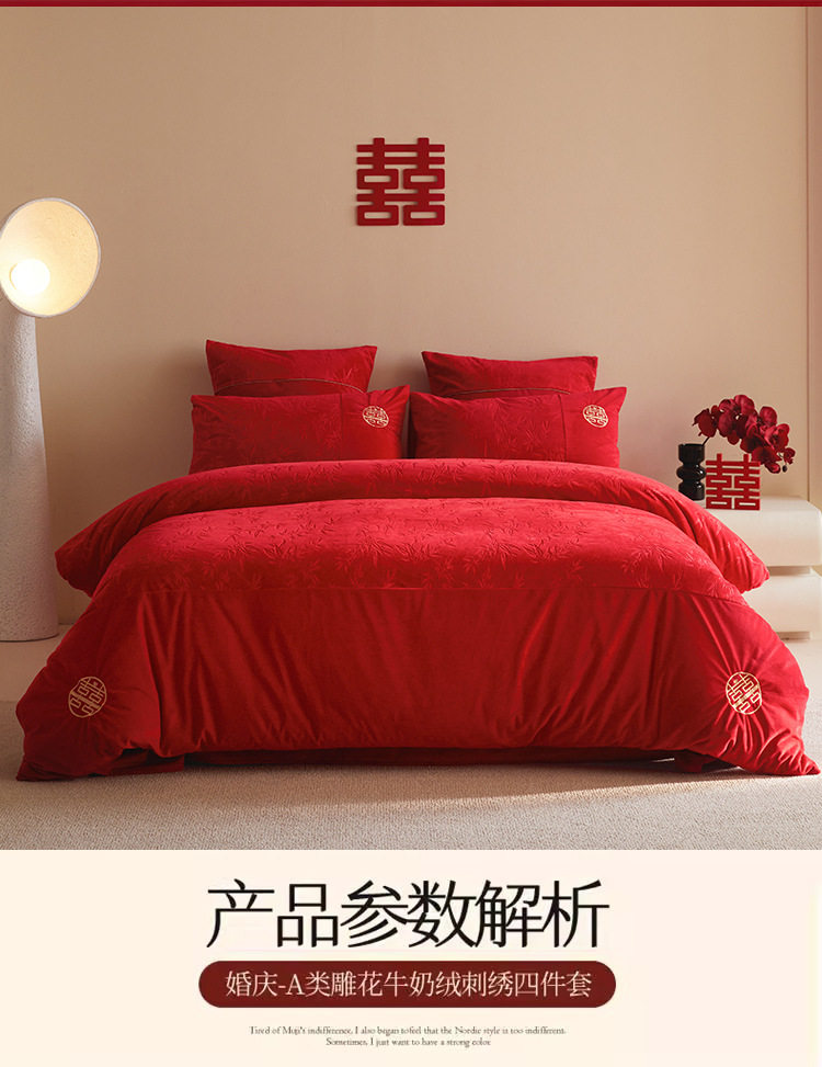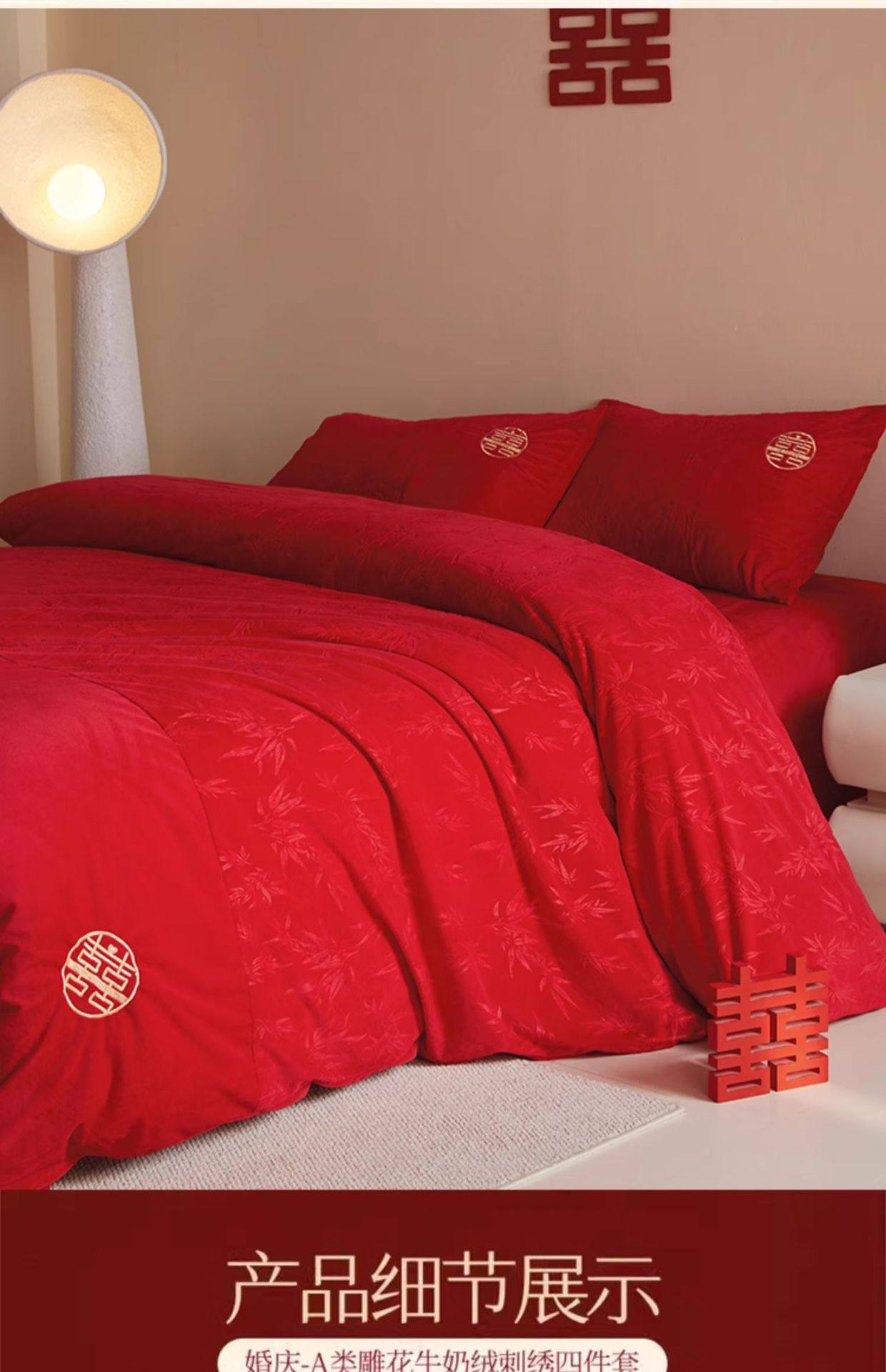 Milk Velvet Bed Four-Piece Set, Bright Red Chinese Style High-End Embroidered Bed Sheetss and Quilt Covers, Winter Wedding Bedding