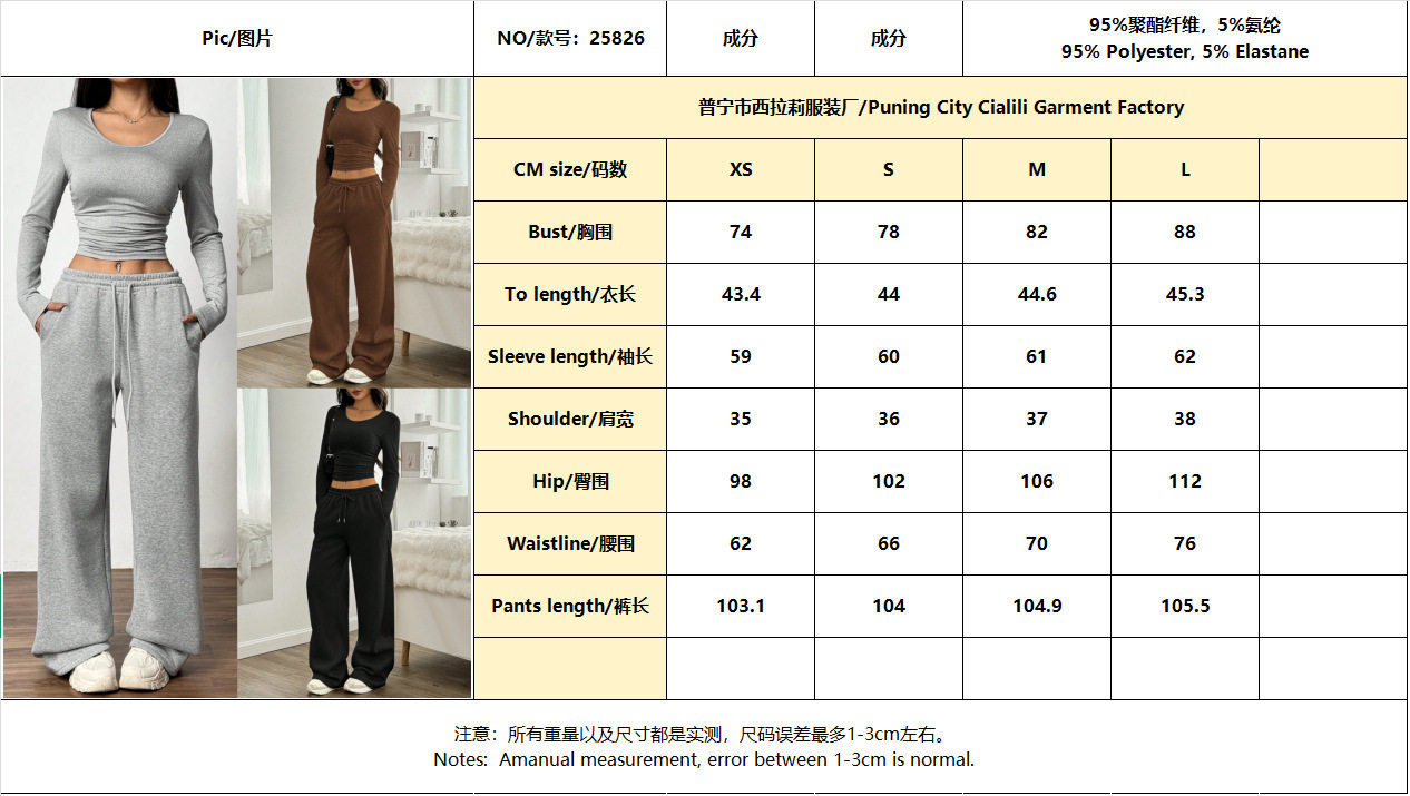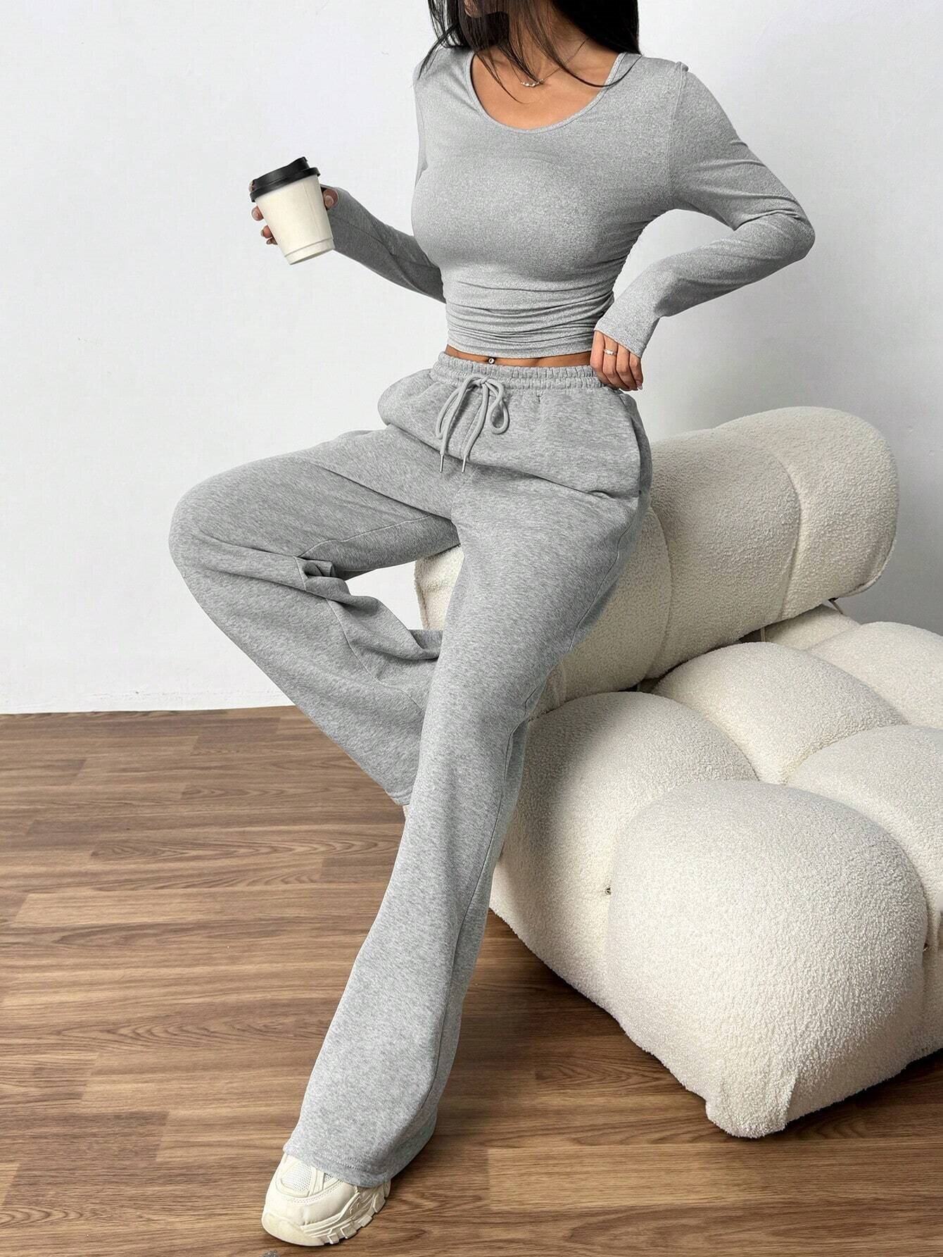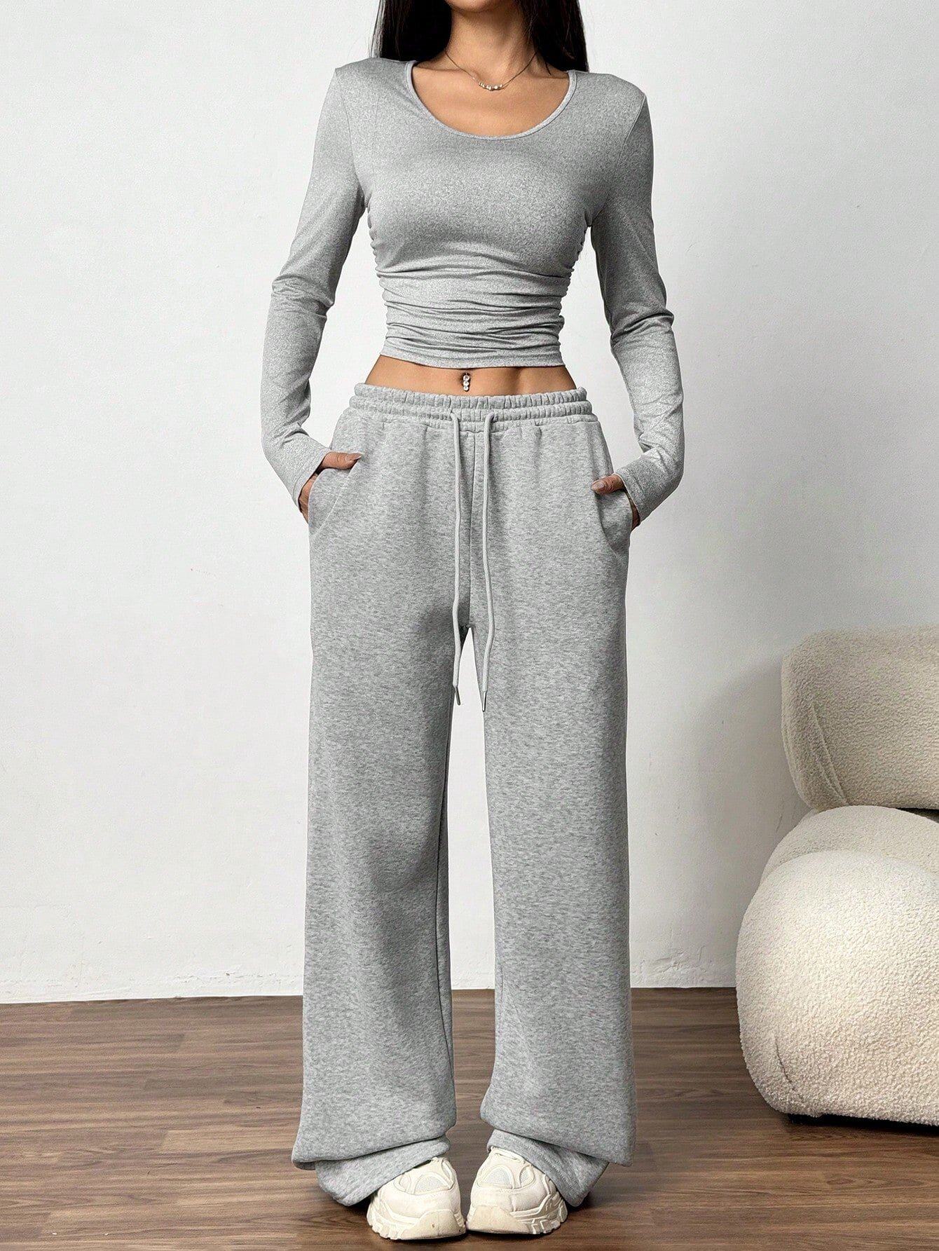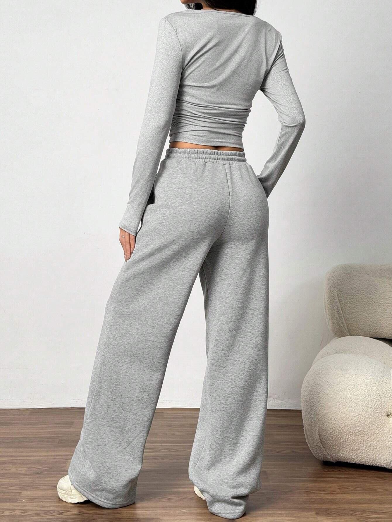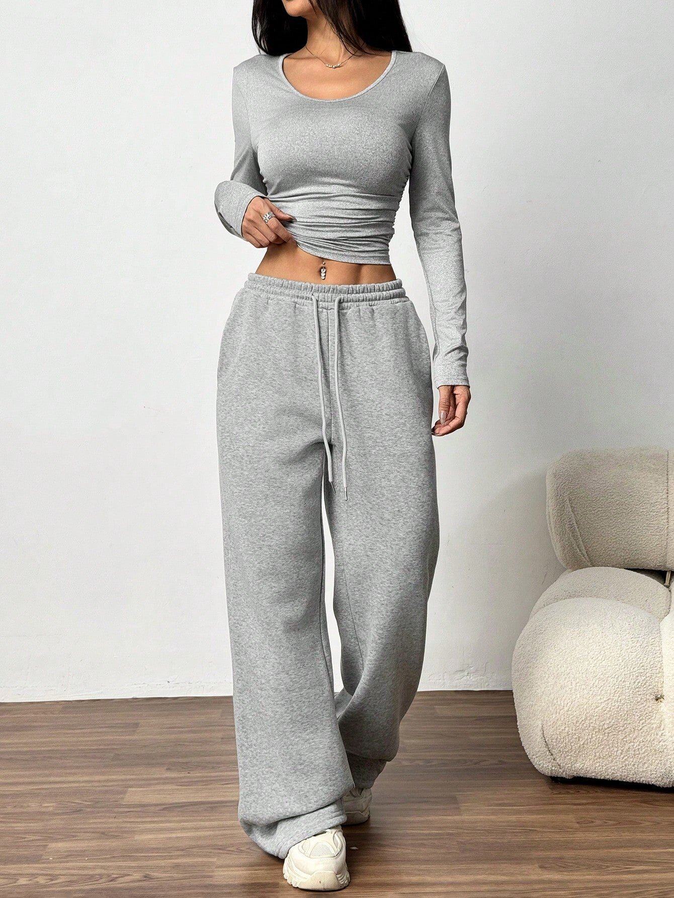 European and American Women's Clothing Cross-Border Fashion Casual Wide-Leg Pants Long-Sleeved Round Neck Solid Color Slim Two-Piece Autumn and Winter Suit