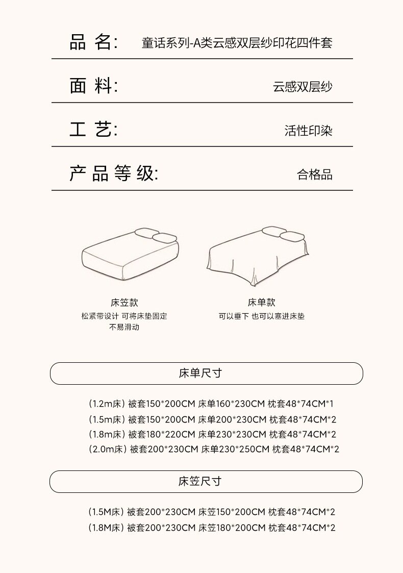 | Size specifications | 1.2m bed sheet [quilt cover 150x200cm] three-piece set [no pilling - no fading],1.5m bed sheet [quilt cover 150x200cm] four-piece set [no pilling - no fading],1.8m bed sheet model [quilt cover 180x220cm] four-piece set [no pilling - no fading],2.0m bed sheet [quilt cover 200x230cm] four-piece set [no pilling - no fading],1.5m fitted sheet [quilt cover 200x230cm] four-piece set [no pilling - no fading],1.8m fitted sheet [quilt cover 200x230cm] four-piece set [no pilling - no fading],150*200 single quilt cover [no pilling and no fading],180*220 single quilt cover [no pilling and no fading],200*230 single quilt cover [no pilling and no fading] |