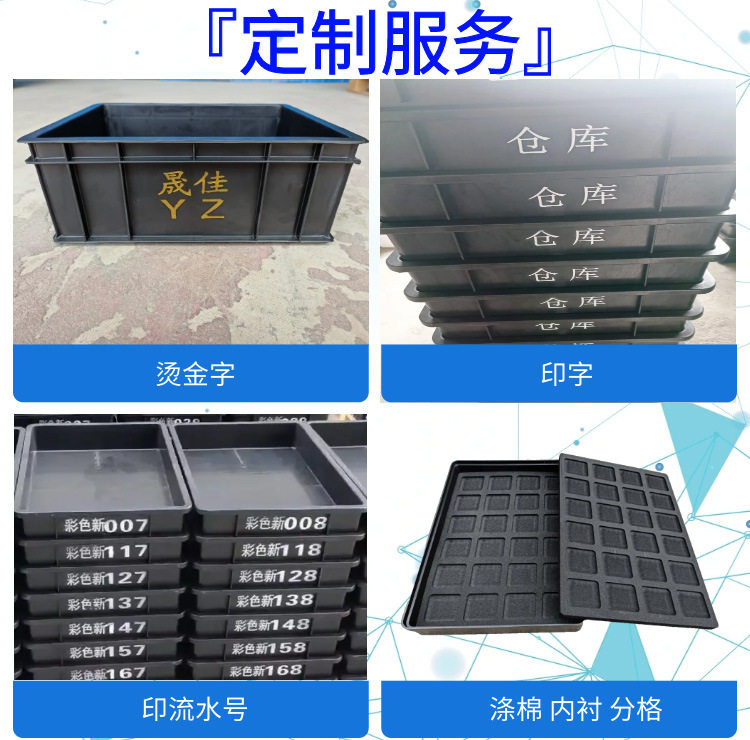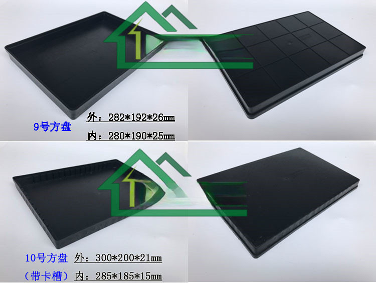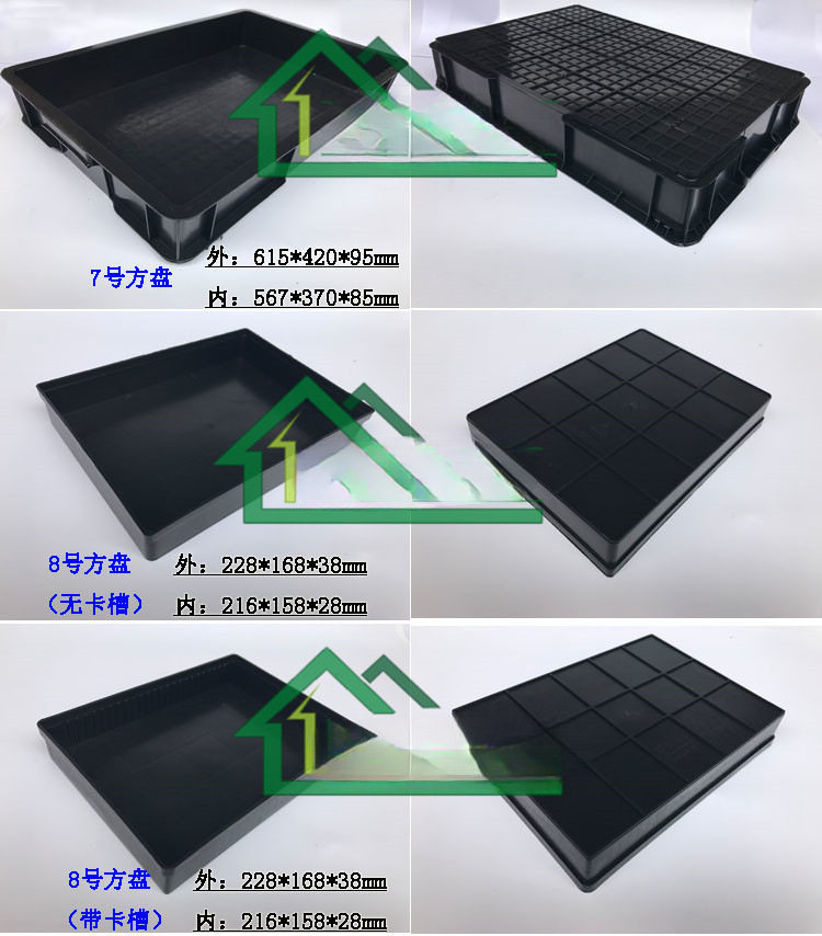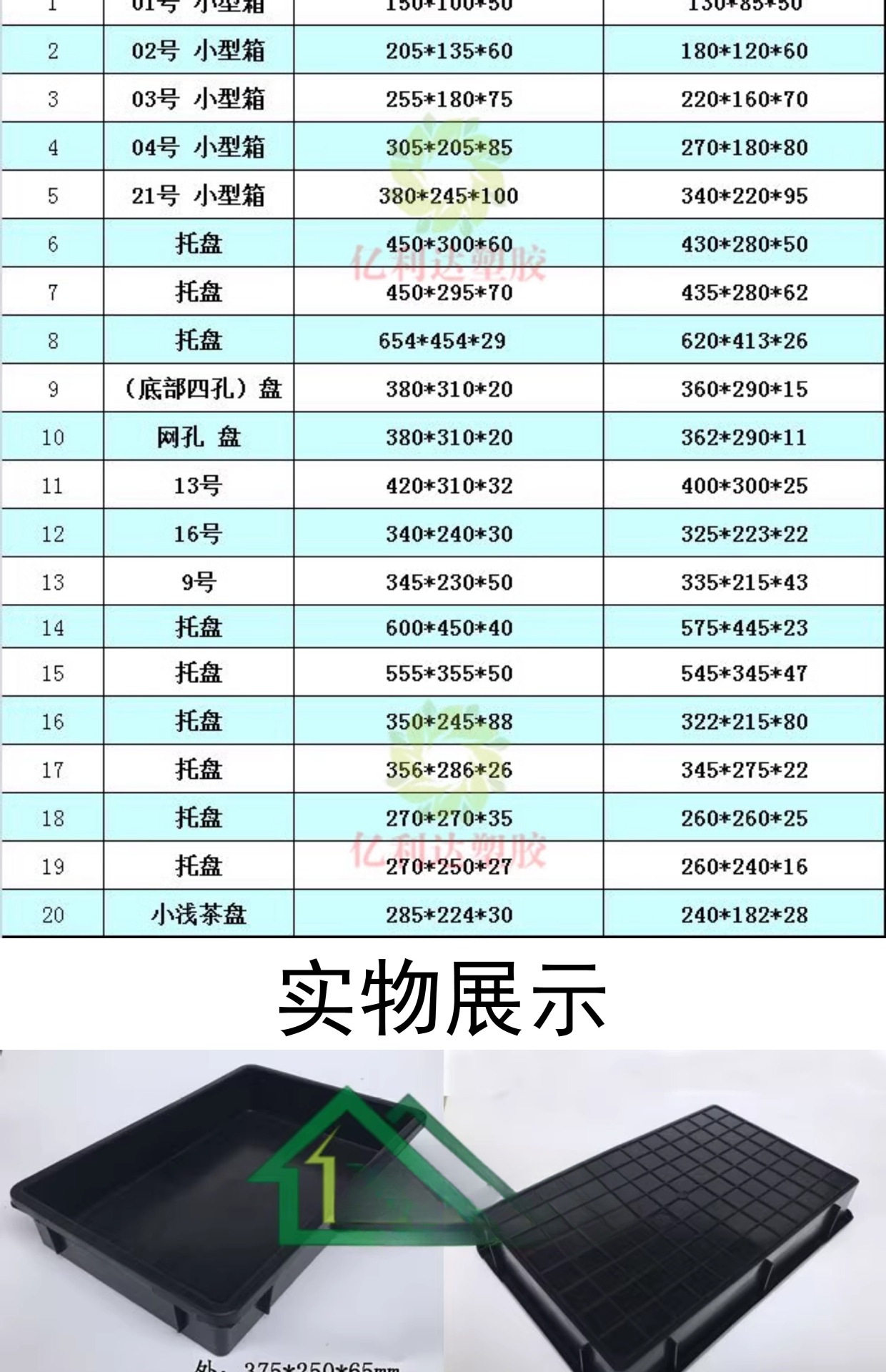 | Specifications and models | Box no. 03 255*180*75mm,Box no. 04 305*205*85mm,Box no. 21 380*245*100mm,Square plate no. 1 375*250*65mm,No. 2 square plate 440*295*80mm,No. 3 square plate thickened 560*375*75mm thickened,No. 4 square plate 320*235*43mm,No. 5 shallow tray 480*328*42mm,No. 6 square plate 440*290*50mm,No. 7 square plate 615*420*95mm,No. 8-with card slot 228*168*38mm,No. 8 (without card slot) 228*168*38mm,No. 9 square plate 282*192*26mm,No. 10 with card slot 300*200*21mm,No. 11 square plate 380*310*28 reinforced,No. 11 square plate 380*310*28 without reinforcement,No. 12 square plate 375*310*20 (not reinforced),No. 12 square plate 375*310*20 (reinforced),No. 13 shallow tray 345*260*30mm,No. 14 shallow plate 345*260*35mm,No. 35 square plate 375*275*40mm,No. 36 square plate 360*360*85mm,(bilateral) no. 45 square plate 450*300*55mm,(thickened bilateral) no. 45 450*300*55mm,No. 46 square plate 450*300*45mm,Tray 530*365*43mm,Tray 556*358*50mm,Large shallow tray 654*454*29mm,Shallow tray 600*450*40mm,Pallet 600*410*50mm,Tray 270*270*32mm,Tray 270*250*27mm,Spacer length 436*width 43mm,595*540*35 customized model |