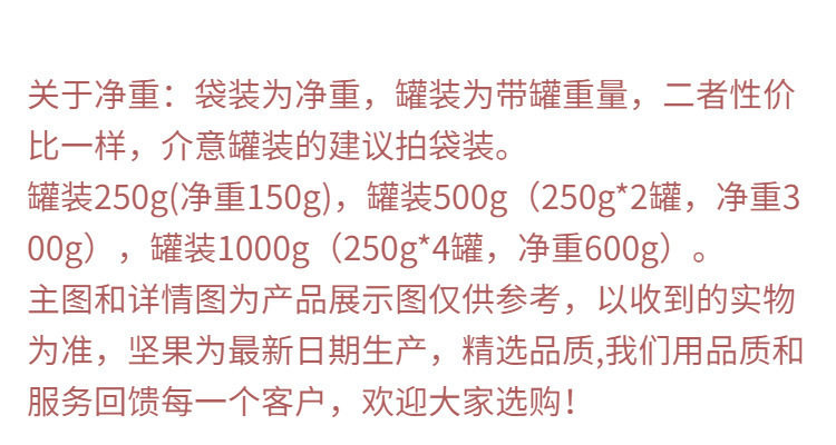 | Packaging specifications | [limited time event] 250g per can,[limited time event] style-500g,[4-pack family size]- 1.0kg pack,[large particles, plump and easy to peel]-250g,[recommended peeling of large particles]-500g,[large particles and cost-effective] 1000g,[2 bags] - 0.5kg pack,[net weight 1 bag] - half a catty |