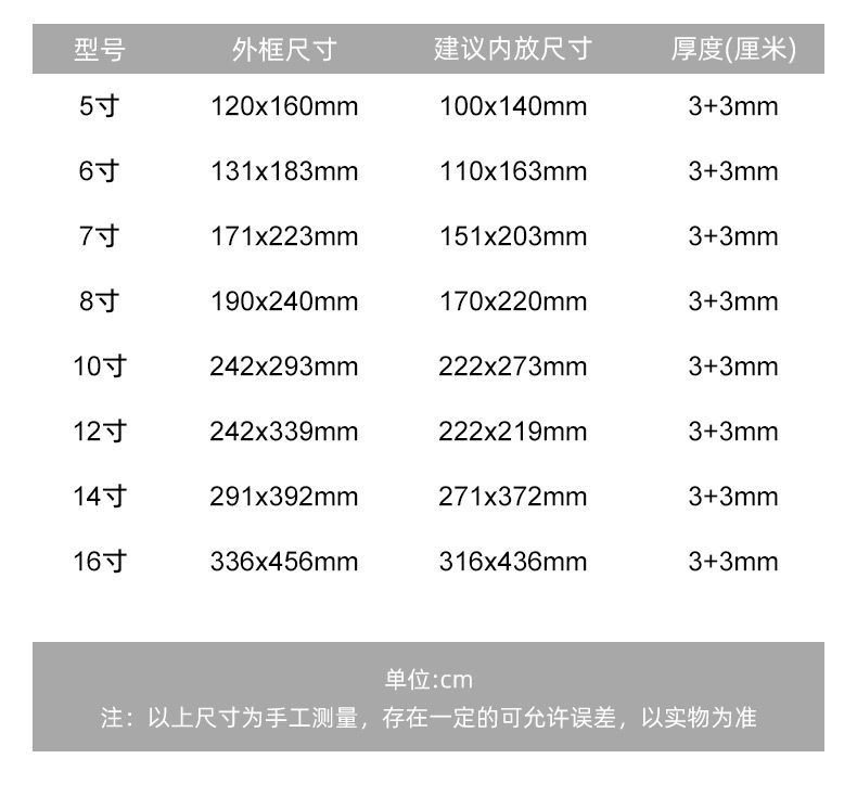 | Inner frame size | Straight edge 5inch (outer frame 12*16cm, inner page 8.9*12.7cm),Straight edge 6inch (outer frame 13.2*18.3cm, inner page 10.2*15.3cm),Straight edge 7inch (outer frame 17.1*22.3cm, inner page 12.7*17.8cm),Straight edge 8inch (outer frame 19*24cm, inner page 15.2*20.3cm),Straight edge 10inch (outer frame 24.2*29.3cm, inner page 20.3*25.4cm),Straight edge 12inch a4 (outer frame 24.2*33.9cm, inner page 21*29.7cm),Straight edge 14inch (outer frame 29.1*39.2cm, inner page 25.4*33.5cm),Straight edge 16inch a3 (outer frame 33.5*45.5cm, inner page 30*42cm),Bevel 5inch ((outer frame 12*16cm, inner page 8.9*12.7cm),Bevel 6inch (outer frame 13.2*18.3cm, inner page 10.2*15.3cm),Bevel 7inch (outer frame 17.1*22.3cm, inner page 12.7*17.8cm),Bevel 8inch (outer frame 19*24cm, inner page 15.2*20.3cm),Bevel 10inch (outer frame 24.2*29.3cm, inner page 20.3*25.4cm),Bevel edge 12inch a4 (outer frame 24.2*33.9cm, inner page 21*29.7cm),Bevel 14inch (outer frame 29.1*39.2cm, inner page 25.4*33.5cm),Bevel 16inch a3 (outer frame 33.5*45.5cm, inner page 30*42cm) |