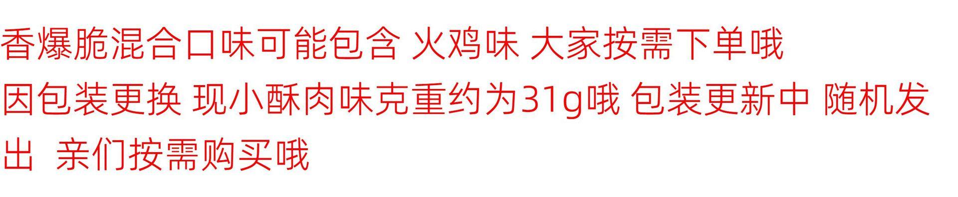 | Packaging specifications | Tomato flavor. [about 33g*10 packs],Salt and pepper crispy pork flavor. [about 33g*10 packs],Spicy crayfish flavor. [about 33g*10 packs],Chive chicken sauce flavor. [about 33g*10 packs],Sizzling barbecue flavor. [about 33g*10 packs],Mixed flavor. [about 33g*10 packs],Tomato flavor. [about 33g*20 packs],Salt and pepper crispy pork flavor. [about 33g*20 packs],Spicy crayfish flavor. [about 33g*20 packs],Chive chicken sauce flavor. [about 33g*20 packs],Sizzling barbecue flavor. [about 33g*20 packs],Mixed flavor. [about 33g*20 packs],Tomato flavor. [about 33g*30 packs],Salt and pepper crispy pork flavor. [about 33g*30 packs],Spicy crayfish flavor. [about 33g*30 packs],Chive chicken sauce flavor. [about 33g*30 packs],Sizzling barbecue flavor. [about 33g*30 packs],Mixed flavor [about 33g*30 packs] |