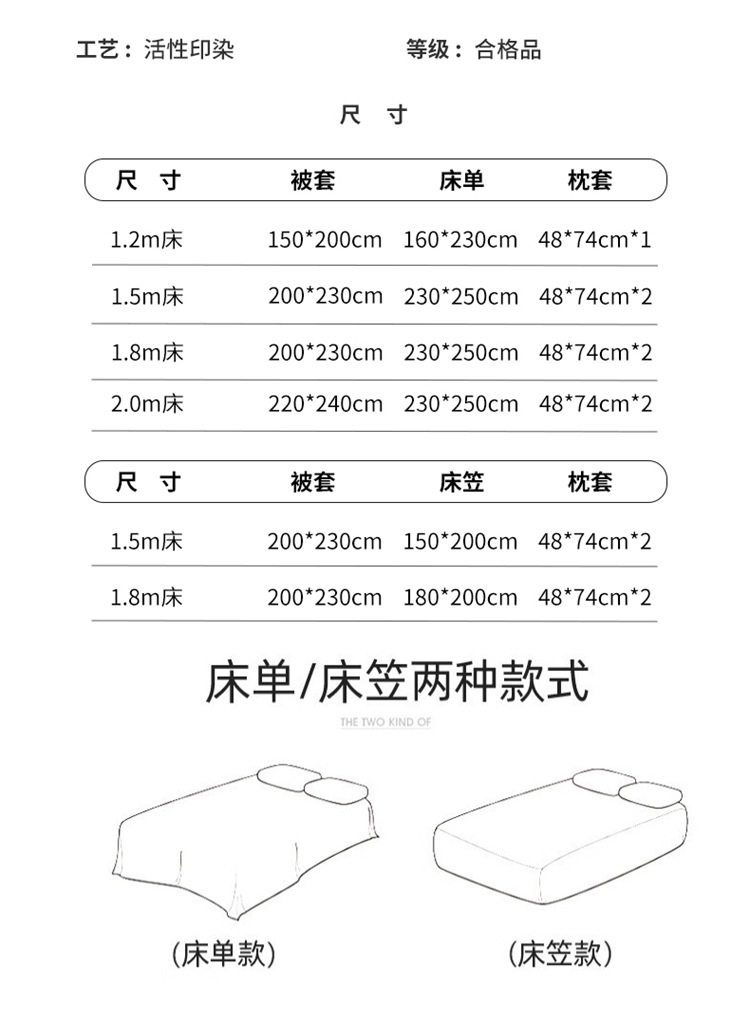 | Size specifications | [sheet type] 0.9m bed three-piece set - quilt cover 150x200,[sheet model] 1.2m bed three-piece set-quilt cover 150x200,[sheet type] 1.5m bed four-piece set-quilt cover 200x230,[sheet model] 1.8m bed four-piece set-quilt cover 200x230,[sheet style] 2.0m bed four-piece set - quilt cover 220x240,[fitted sheet] 1.5m bed four-piece set-quilt cover 200x230,[fitted sheet] 1.8m bed four-piece set-quilt cover 200x230,150x200cm single quilt cover,180x220cm single quilt cover,200x230cm single quilt cover,220x240cm single quilt cover |