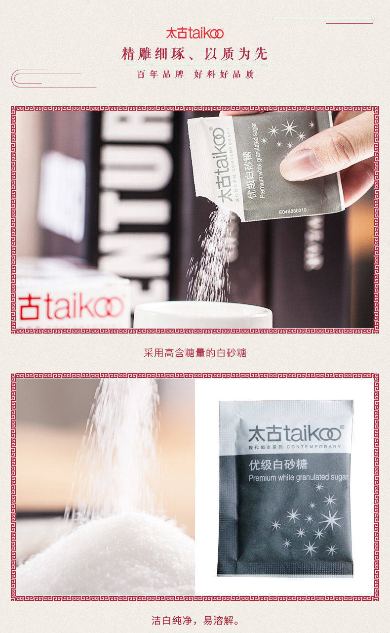 | Packaging specifications | Miaojiji white sugar bag 5g*30 bags,[affordable pack] miaoji white sugar 5g*100 packs,Taikoo white sugar bag 3g*50 bags,Taikoo white sugar bag 5g*50 bags,Taikoo brown sugar bag 5g*50 bags,Taikoo white sugar bag 3g*100 bags,Taikoo white sugar bag 5g*100 bags,Taikoo brown sugar bag 5g*100 bags,Taikoo white sugar bag 5g*424 bags*6 whole box,Swire brown sugar packets 5g*424 packets*6 whole boxes |