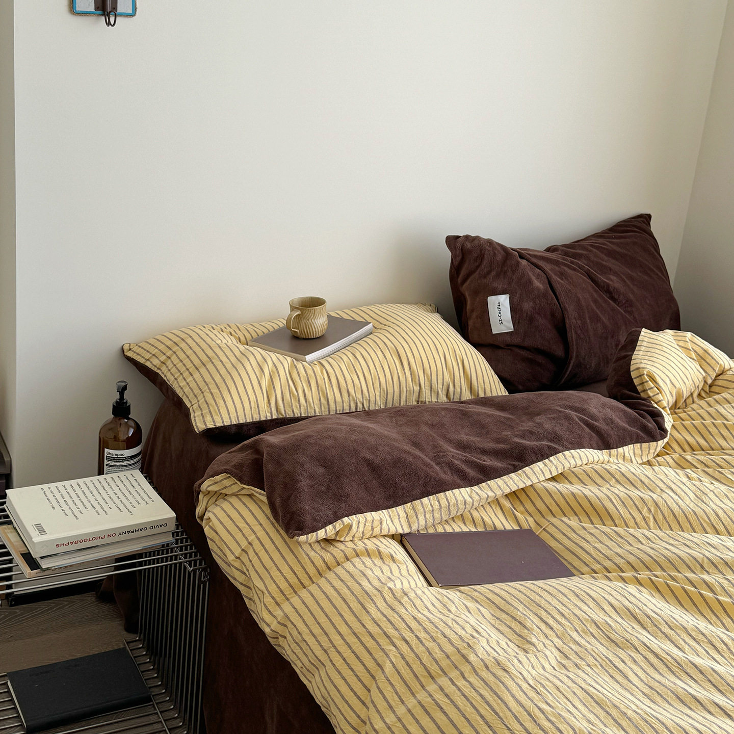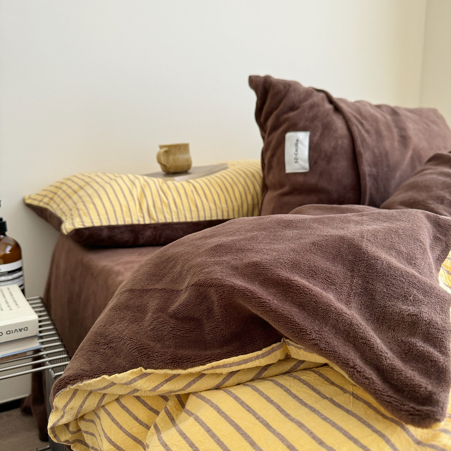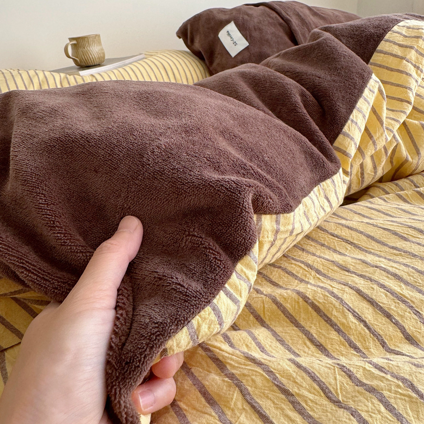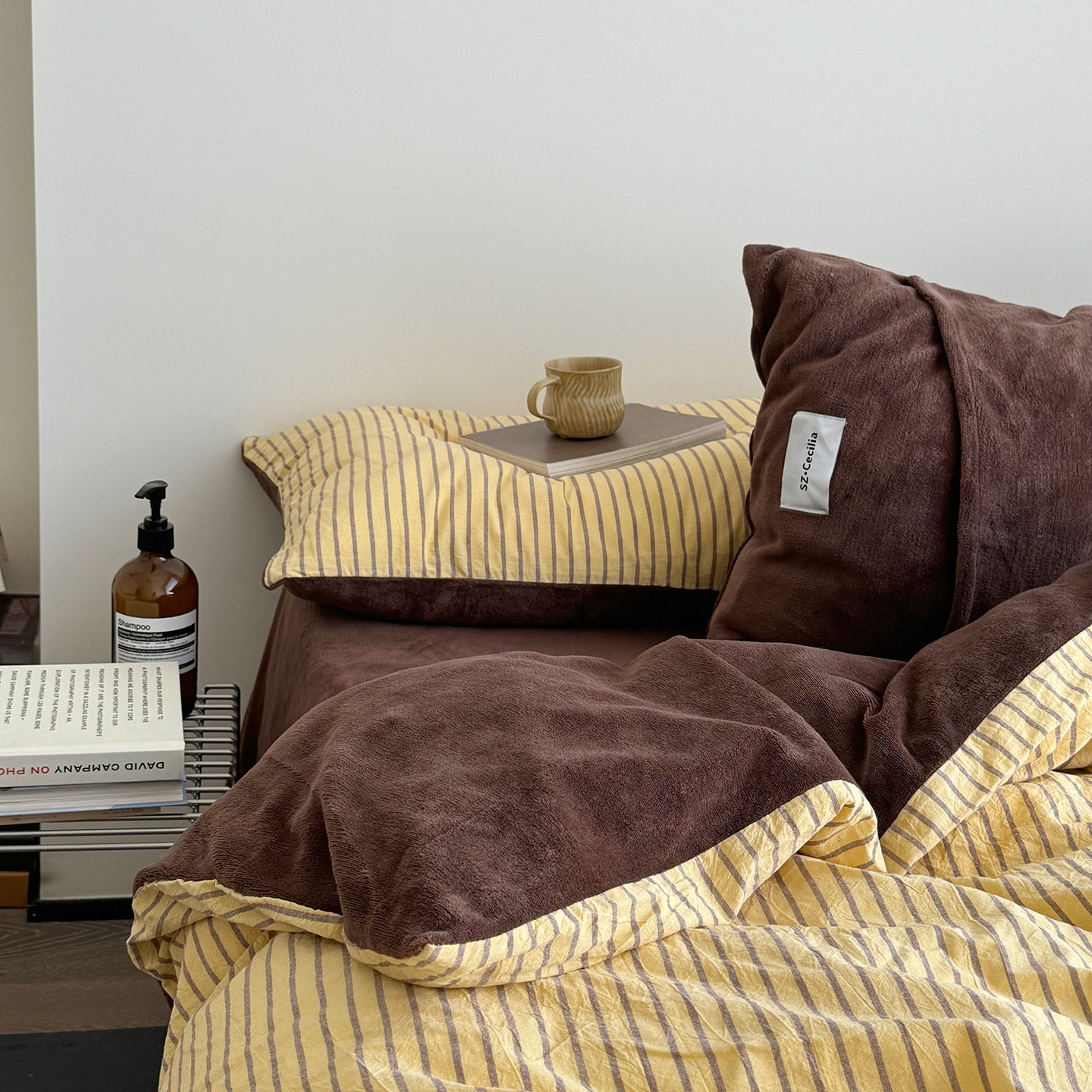 Scandinavian Style Pure Cotton Yarn-Dyed Milk Velvet Four-Piece Winter Stripesd Warm Bed Bed Sheets Quilt Cover Coral Velvet Three-Piece Set
