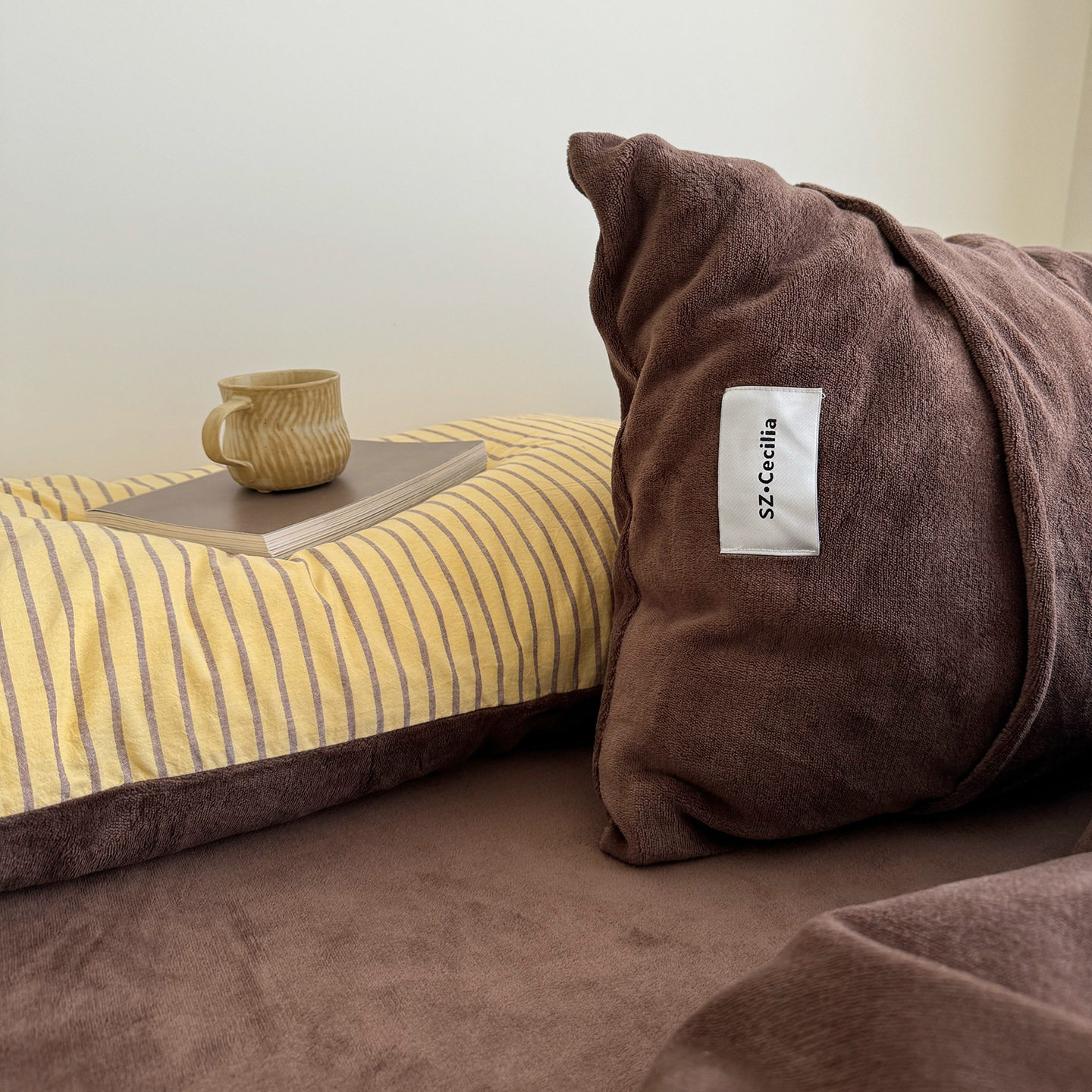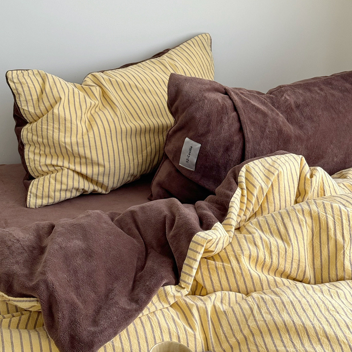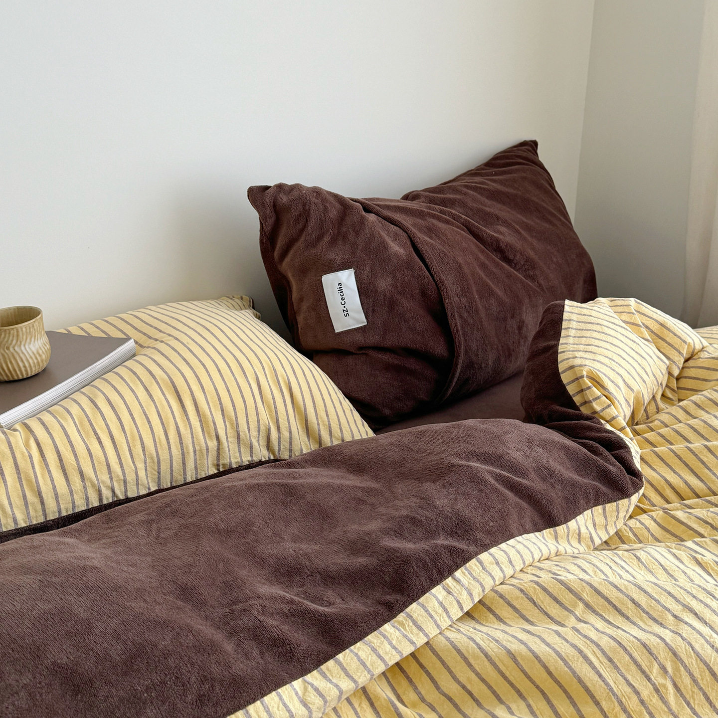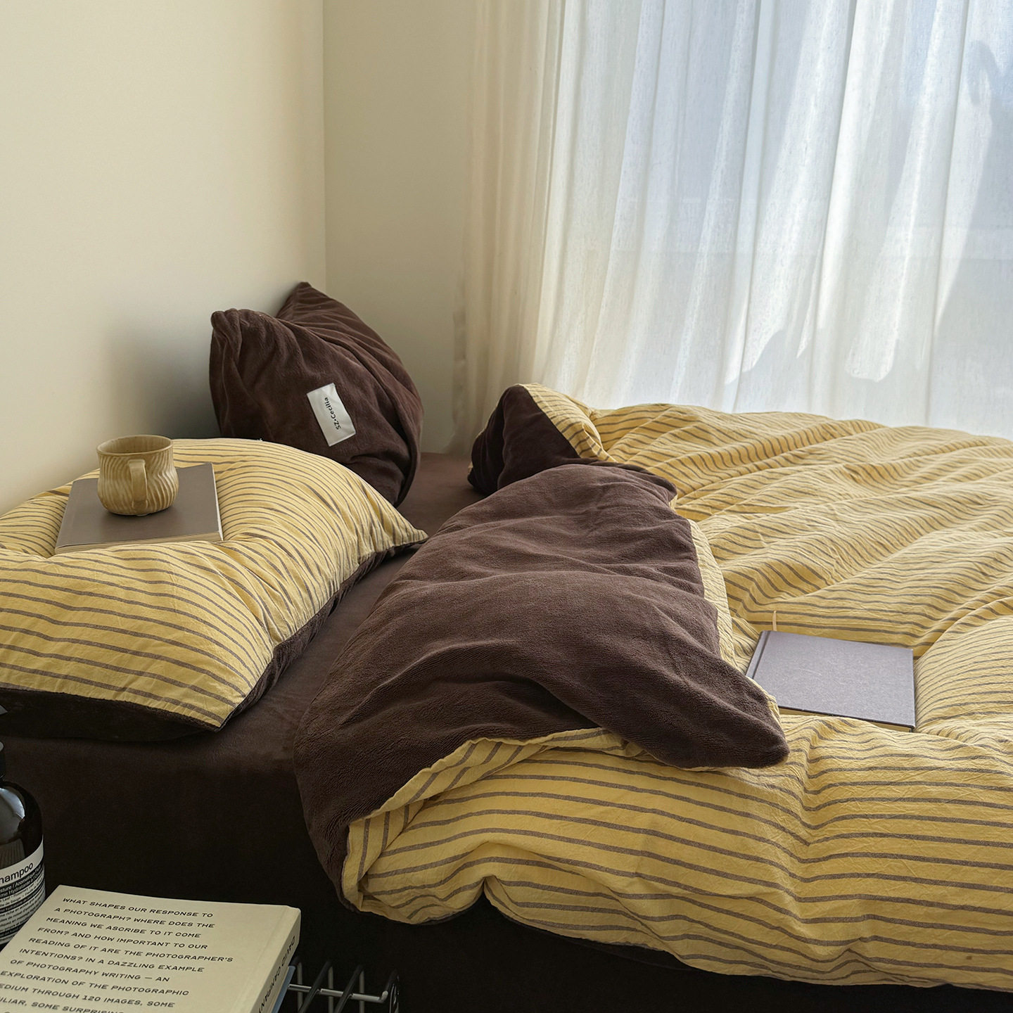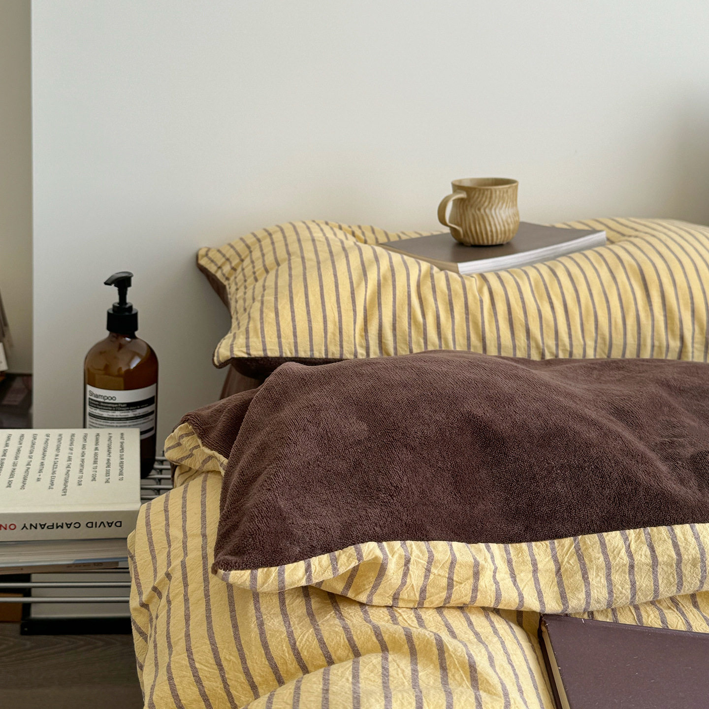 Scandinavian Style Pure Cotton Yarn-Dyed Milk Velvet Four-Piece Winter Stripesd Warm Bed Bed Sheets Quilt Cover Coral Velvet Three-Piece Set