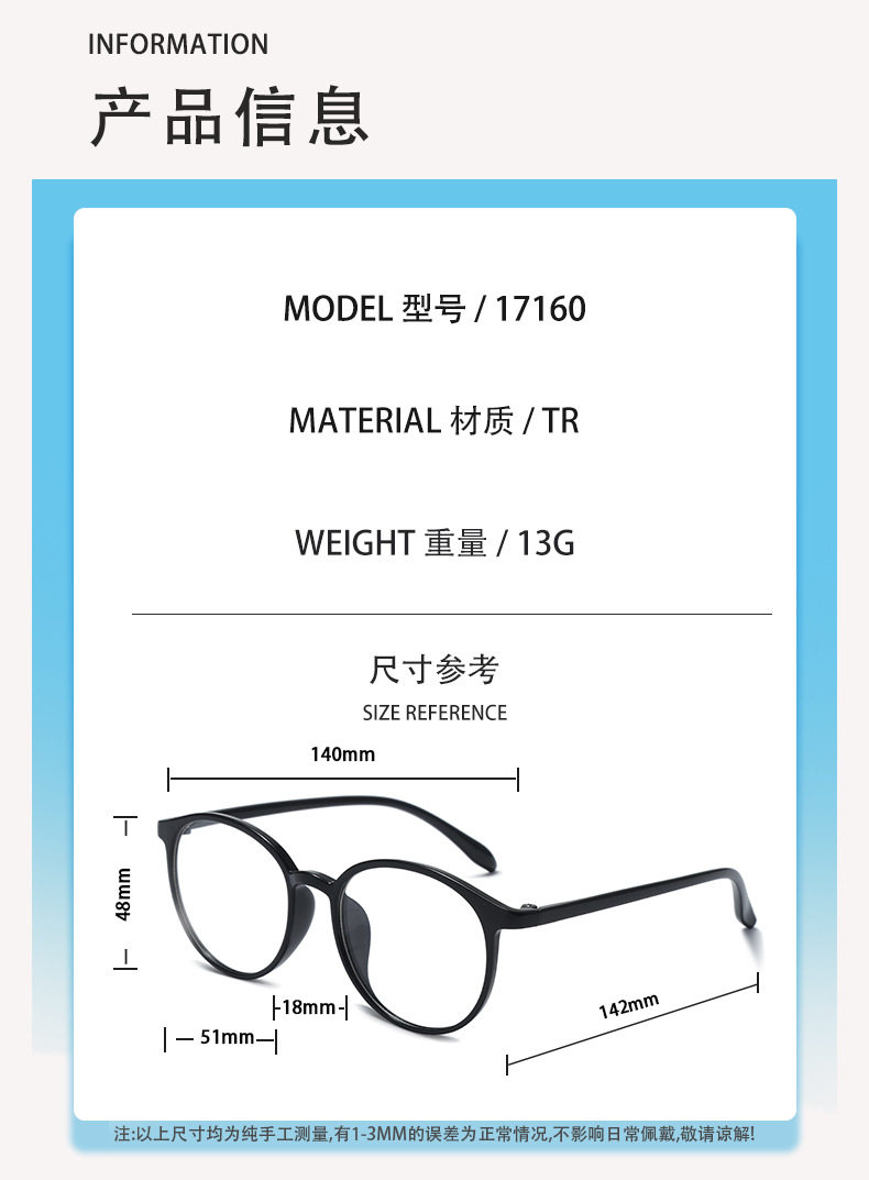 | Frame color | Glossy black,Matte black,Transparent lotus root yellow,Dumb tea powder tea,Tortoiseshell tea,Coffee brown,Transparent white |