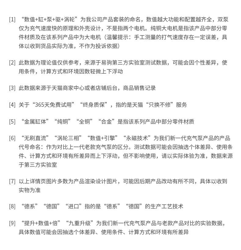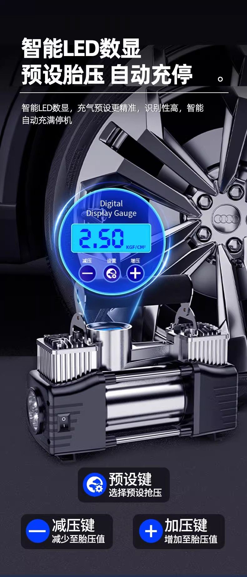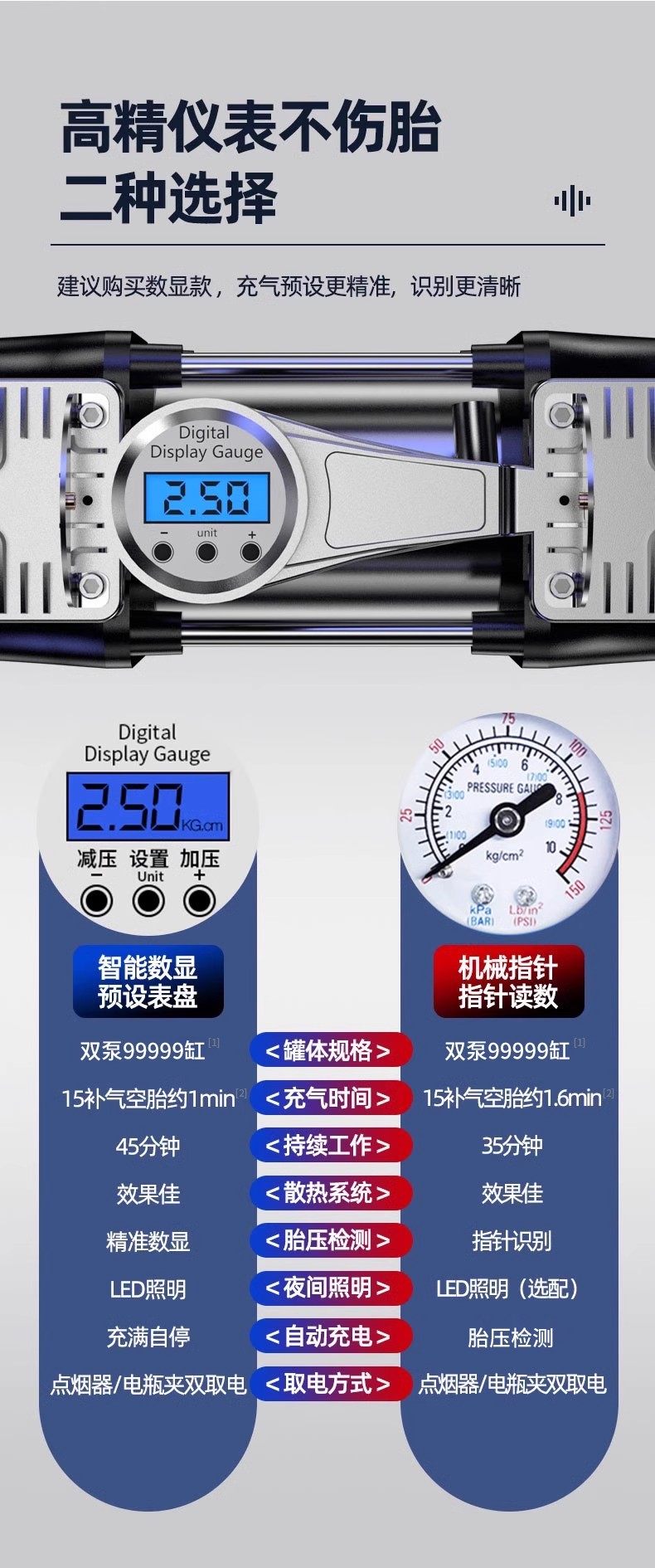 | Specifications | Mechanical model [alloy motor],Mechanical model [alloy motor] comes with battery clip + extension tube + household air nozzle,Mechanical model [alloy motor] comes with a portable storage bag + battery clip + extension tube + household air nozzle,Mechanical model [alloy motor] comes with a portable tool box + tire repair tools + battery clamp + extension tube + household air nozzle,Digital display model [alloy motor],Digital display model [alloy motor] comes with battery clip + extension tube + household air nozzle 2,Digital display model [alloy motor] comes with a portable storage bag + battery clip + extension tube + household air nozzle,Digital display model [alloy motor] comes with a portable tool box + tire repair tools + battery clamp + extension tube + household valve,Upgraded mechanical model [brushless permanent magnet motor] comes with battery clip + extension tube + household air nozzle,Upgraded mechanical model [brushless permanent magnet motor] comes with a portable storage bag + battery clip + extension tube + household air nozzle,Upgraded mechanical model [brushless permanent magnet motor] comes with a portable tool box + tire repair tools + battery clamp + extension tube + household air nozzle,The upgraded digital display model [brushless pure copper motor] comes with a battery clip + extension tube + household air nozzle,Upgraded digital display model [brushless pure copper motor] comes with a portable storage bag + battery clip + extension tube + household air nozzle,Upgraded digital display model [brushless pure copper motor] comes with a portable tool box + tire repair tools + battery clamp + household valve,Top model with digital display [enlarged brushless pure copper motor] comes with battery clip + extension tube + household air nozzle,Top model with digital display [enlarged brushless pure copper motor] comes with a portable storage bag + battery clip + extension tube + household air nozzle,Top model with digital display [enlarged brushless pure copper motor] comes with portable tool box + tire repair tool + battery clamp + extension tube + household air nozzle |