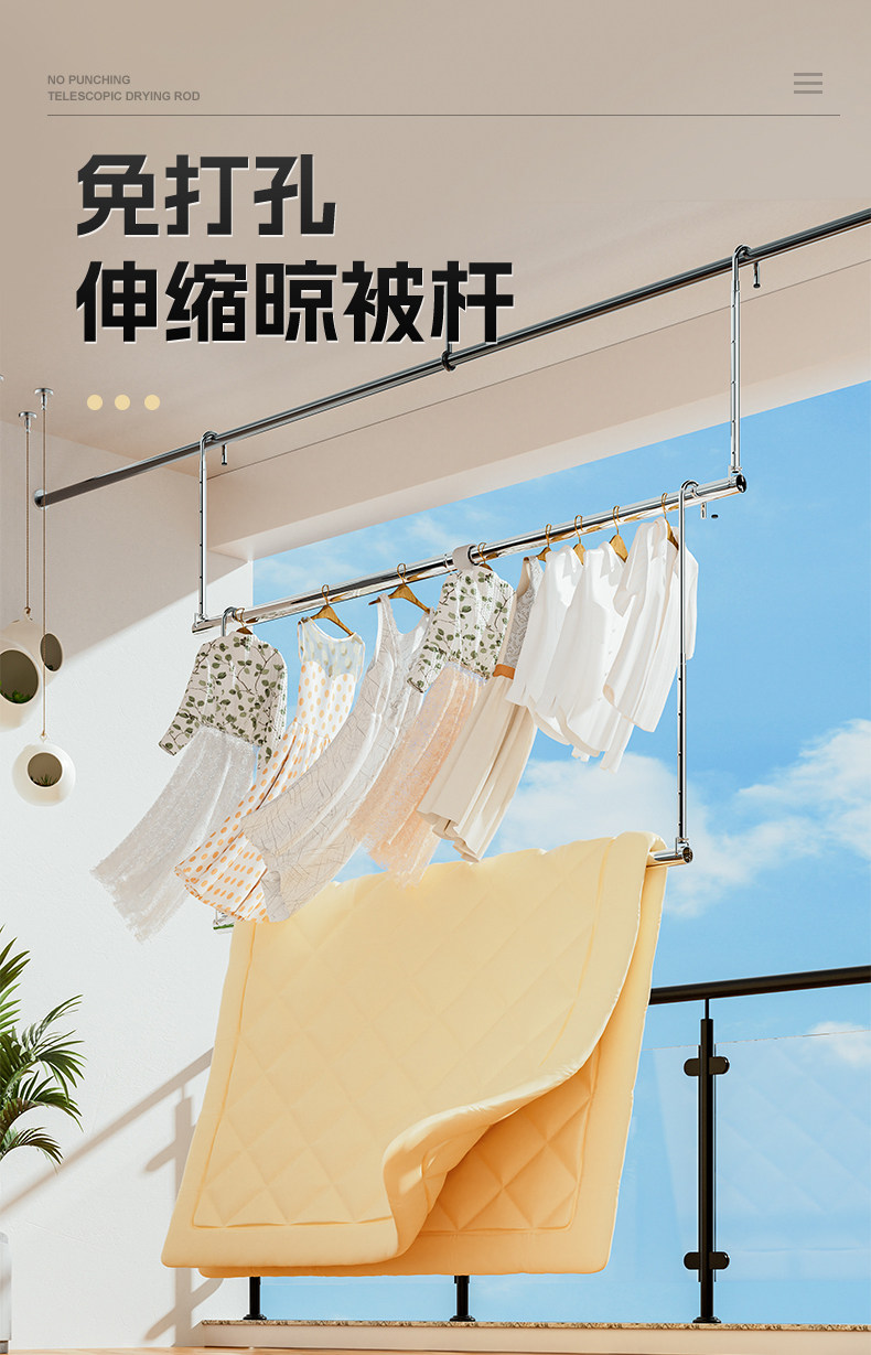Balcony Adjustable Telescopic Clothes Drying Rack, No-Drill Stainless Steel Drying Rack for Clothes, Quilts, and Bed Sheets