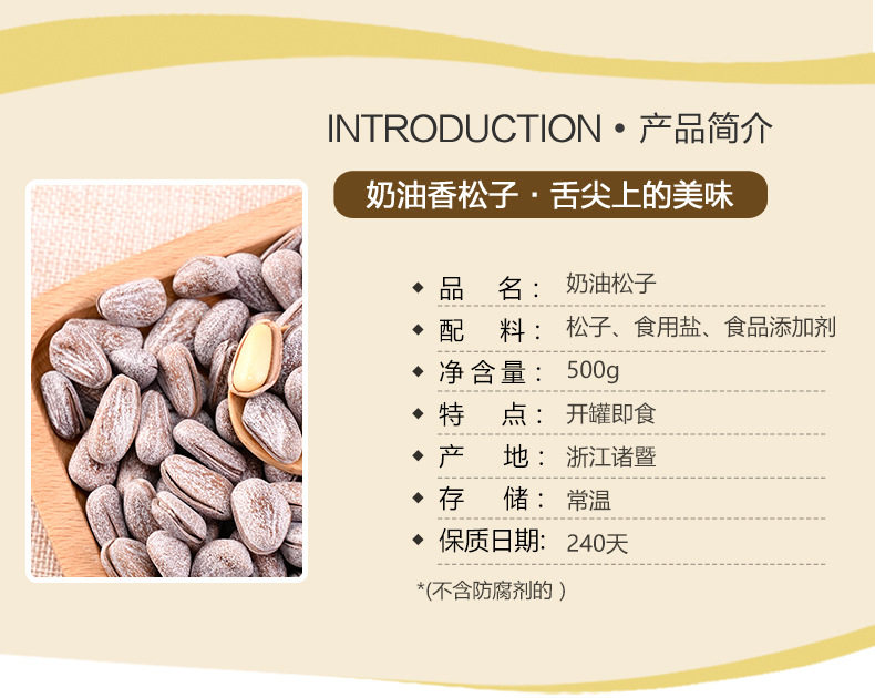 | Raw materials and ingredients | Pine nuts, edible salt, food additives (cyclamate, acesulfame potassium, saccharin sodium, edible flavors)) |