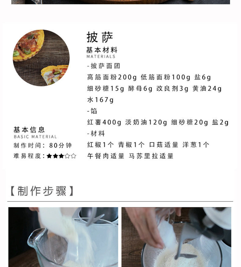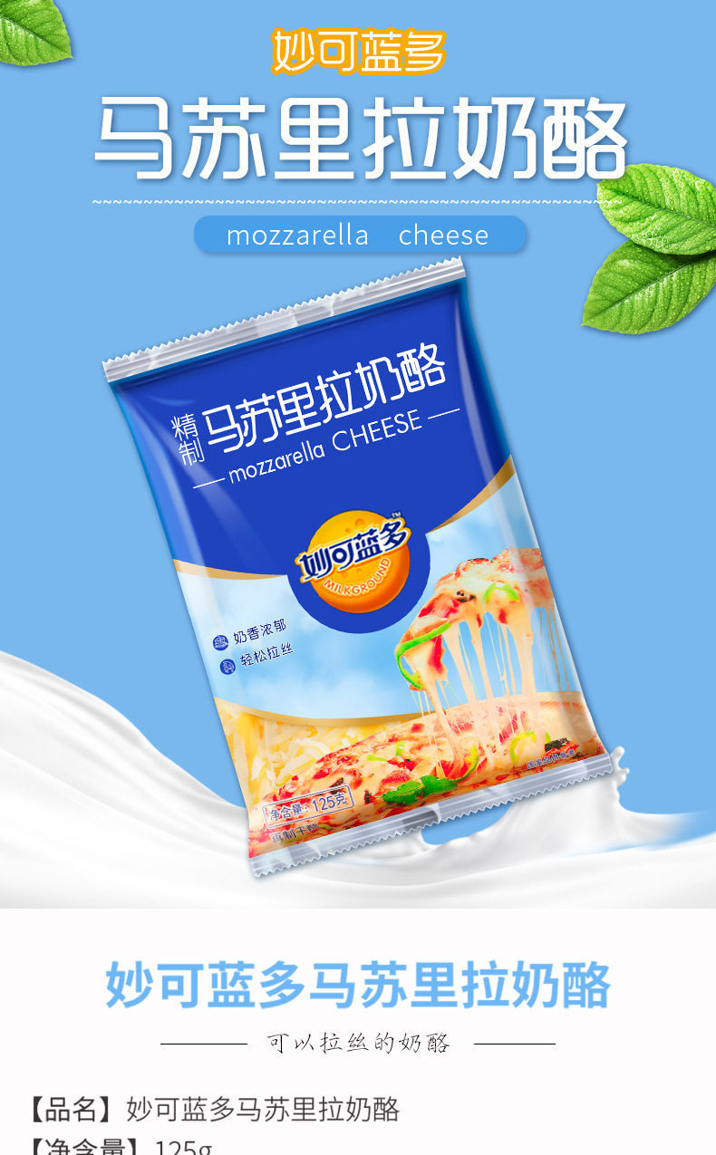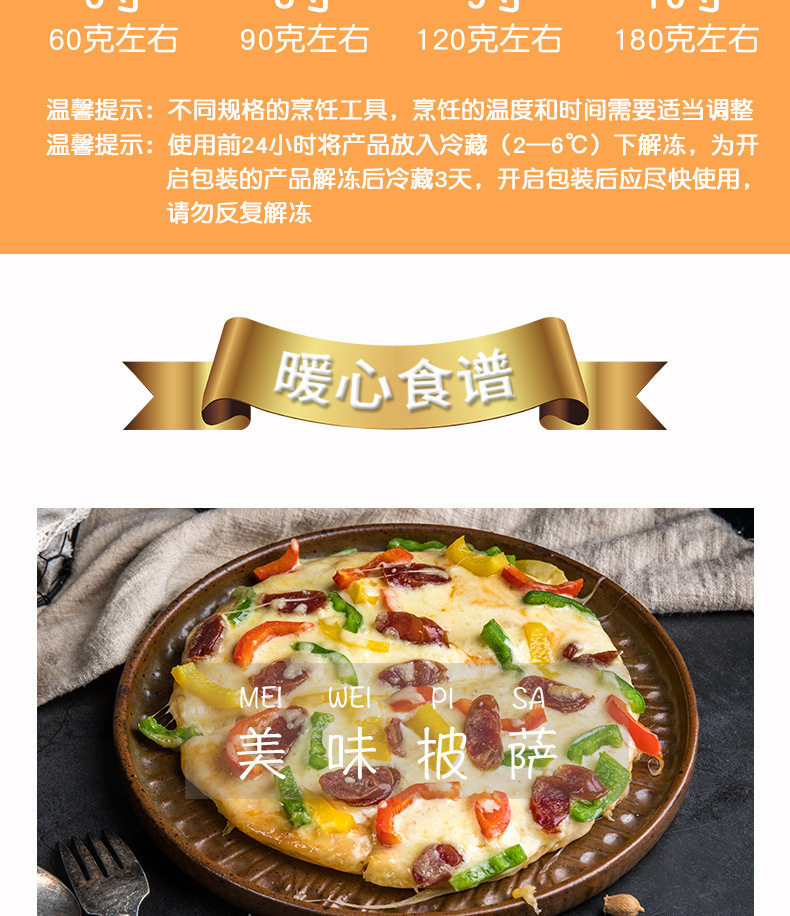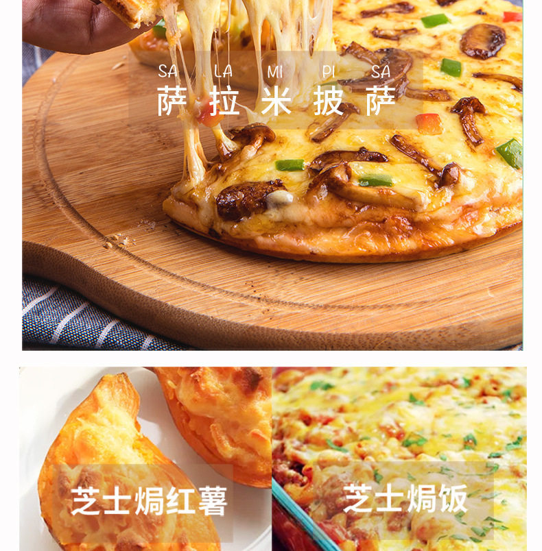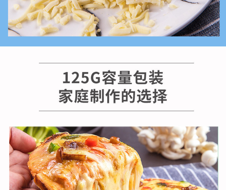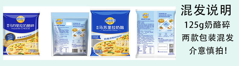 | Packaging specifications | Shredded cheese 125g〖most people’s choice〗,Light-fat cheese shreds 350g 〖new product! ! 〗,Shredded cheese 450g〖large family pack〗,Cheese slices-83 original flavor 5 slices,6inch pizza crust*3〖homemade pizza for 1 person〗,7inch pizza crust*3〖homemade pizza for 2 people〗,8inch pizza crust*3〖homemade pizza for 2 people〗,9inch pizza crust*3〖homemade pizza for 3 people〗,Pizza sauce 100g〖homemade pizza partner〗,Square burgers (60g*6 pieces) [homemade cheese burger],Round burgers (60g*6 pieces) [homemade cheese burger] |